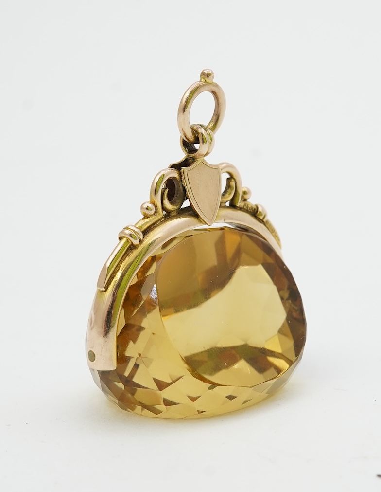 A citrine fob seal, late 19th /early 20th century set with a rotating faceted citrine, to a 9ct gold mount decorated with escutcheons and scrollwork, length 4cm including bail, British hallmark, indistinct date letter