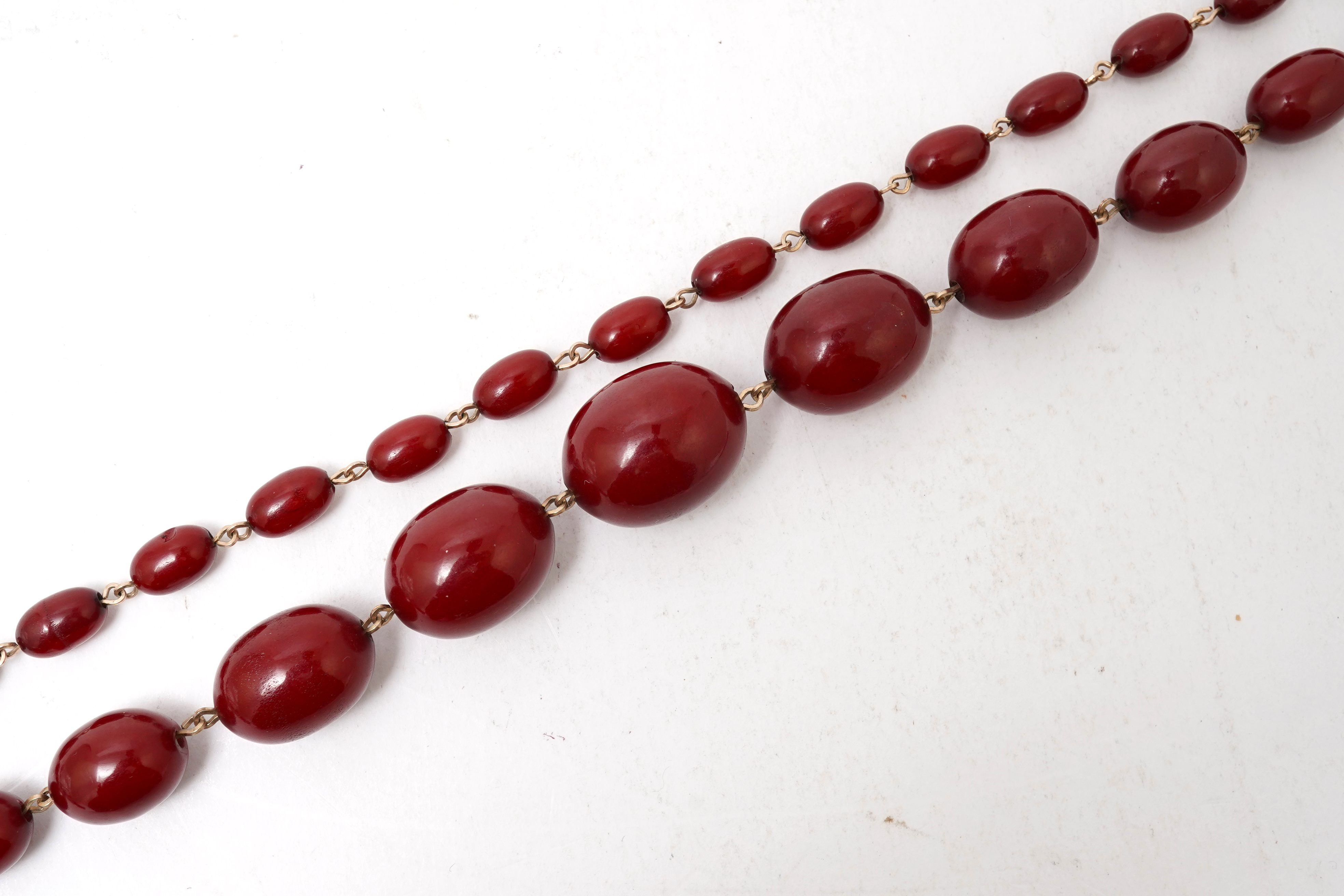 Lot 193 , A cherry-coloured bakelite imitation amber necklace and a glass bead necklace