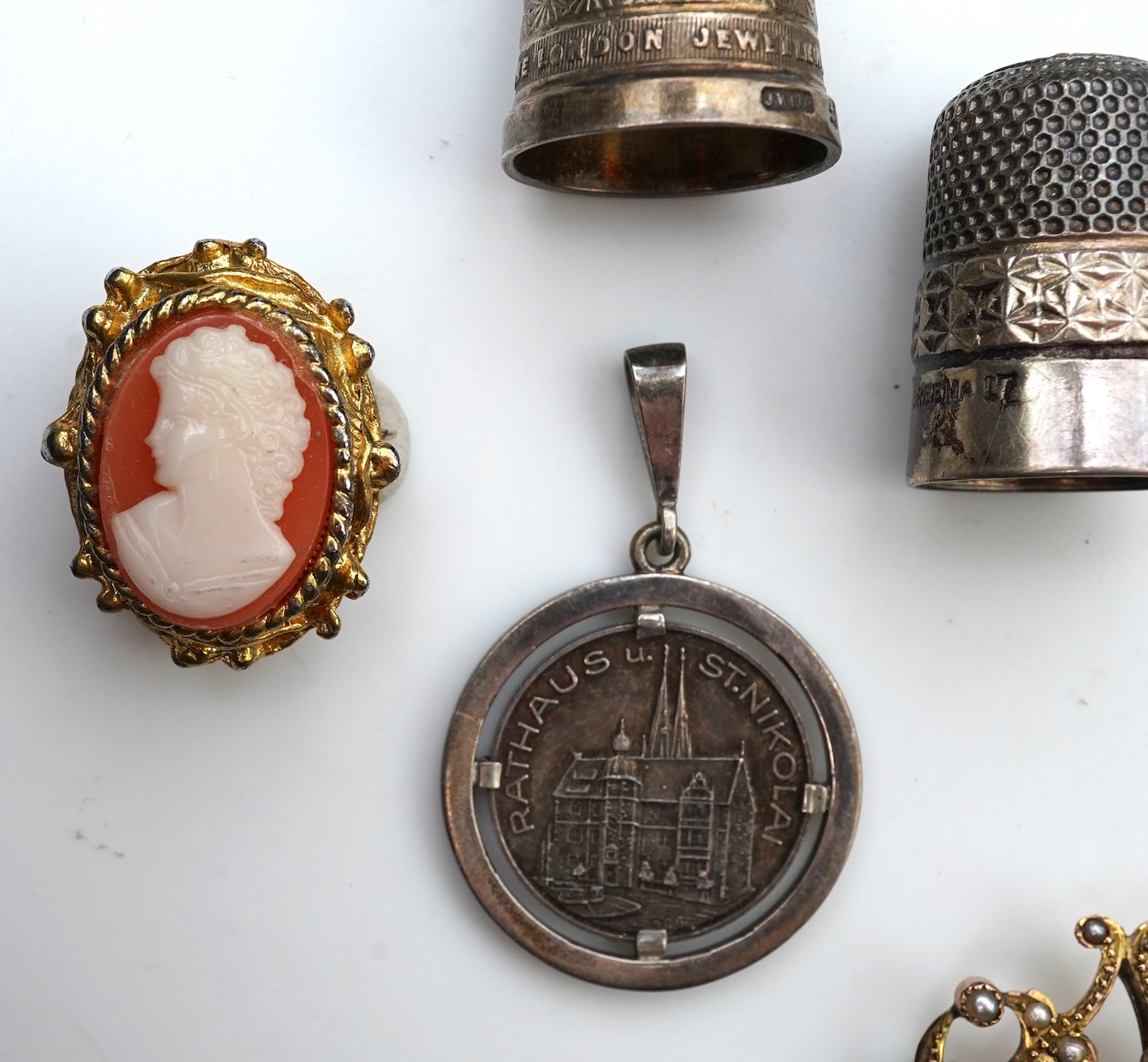 A small group of assorted collectables and jewellery including a Dunhill lighter, 64mm, a George V silver and enamel small compact, silver thimble, two Victorian garnet set brooches, an Edwardian 9ct, amethyst and seed pearl pendant etc.