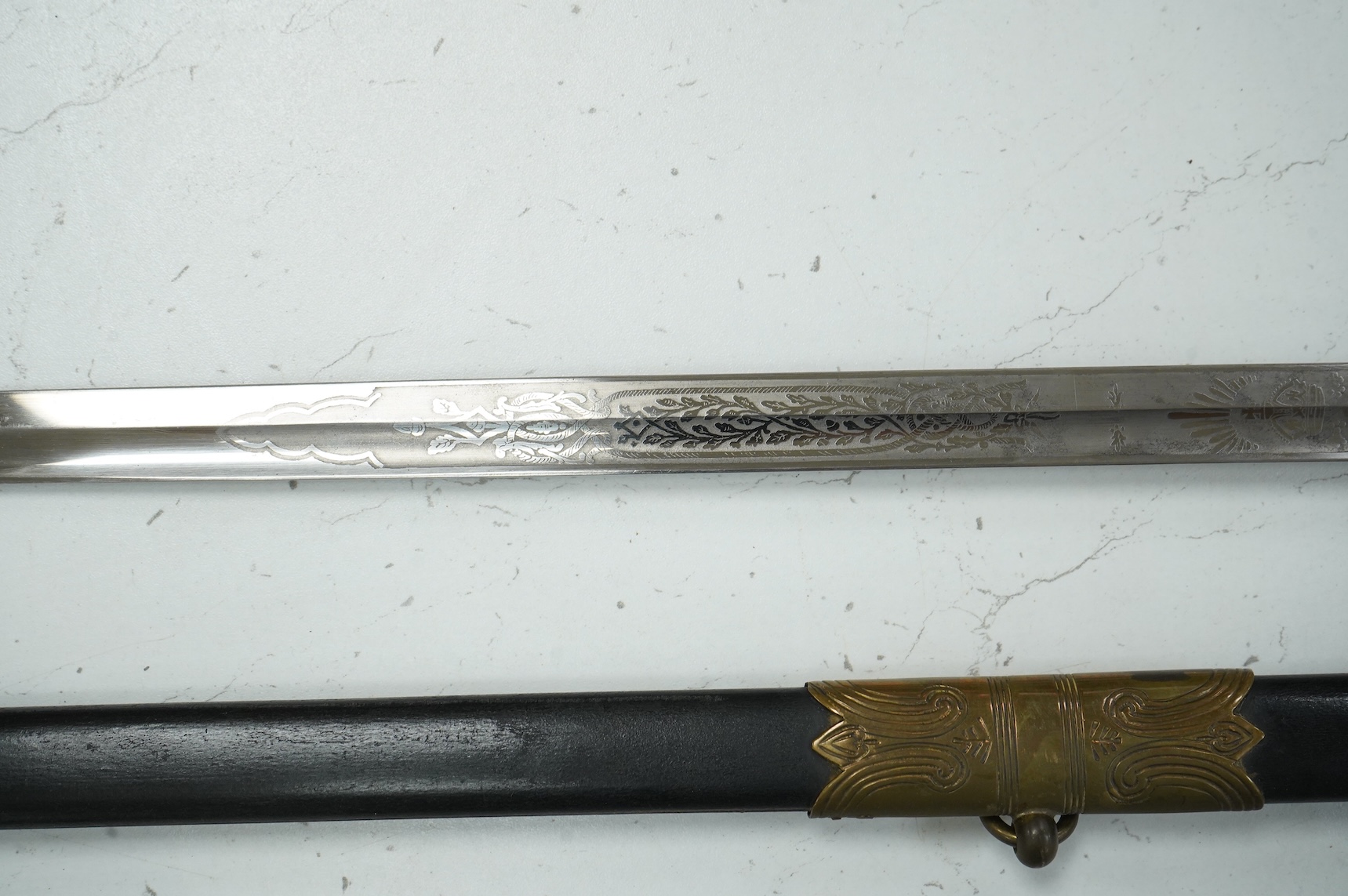 A George V regulation naval officer’s sword, the blade etched and polished, with regulation hilt with folding side guard engraved with owner‘s name R. Colville, bullion dress knot and in its brass mounted leather scabbard, (the engraving understood to refer to Richard Colville, the Queen’s Press Secretary)