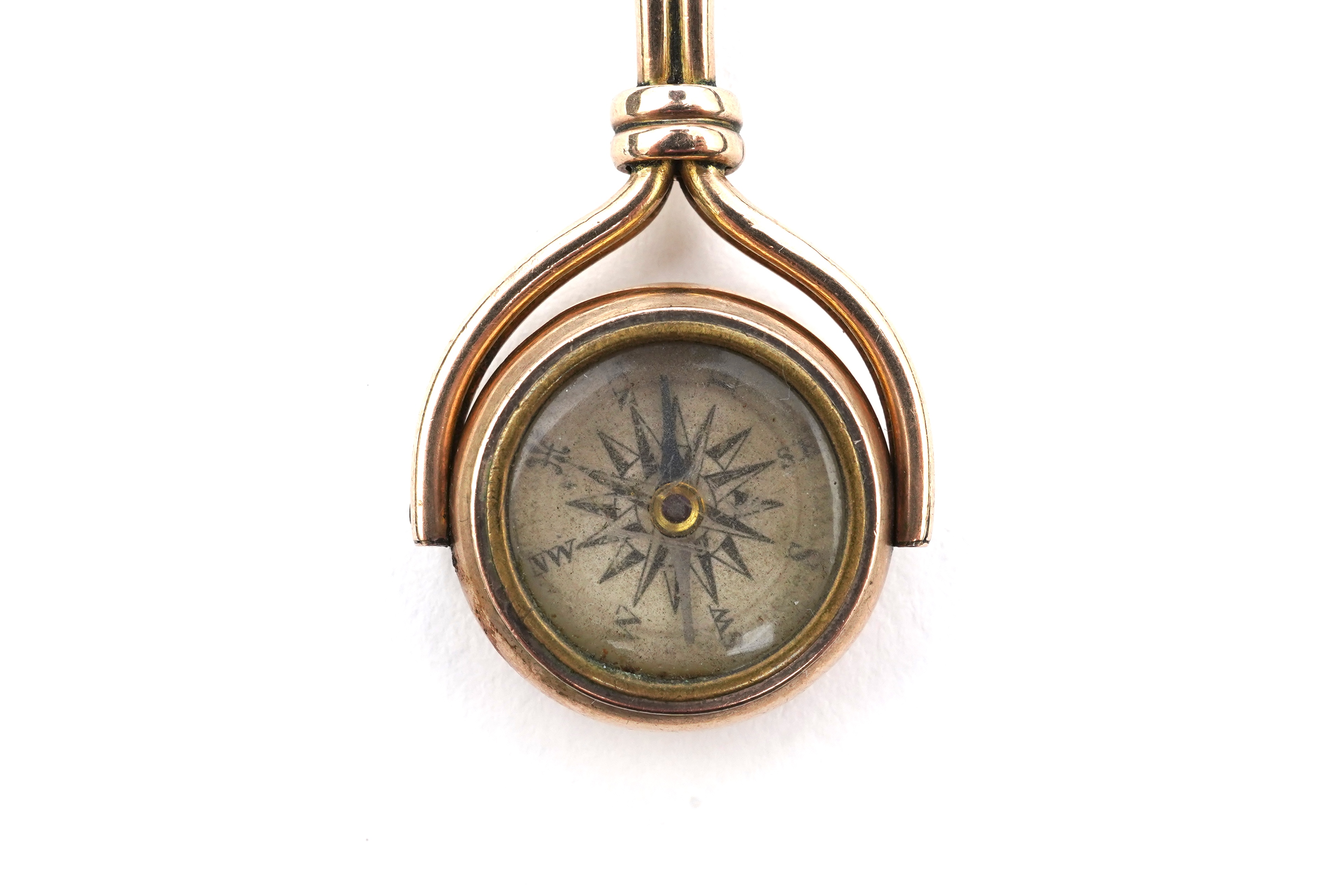 A gold fob pendant, late 19th century, the swivel fob set to one side with a carnelian intaglio depicting a heraldic crest of an eagle, the other with a compass, mounted in gold, length 3.8cm including pendant mount, stamped 10CT, gross weight 7 grams