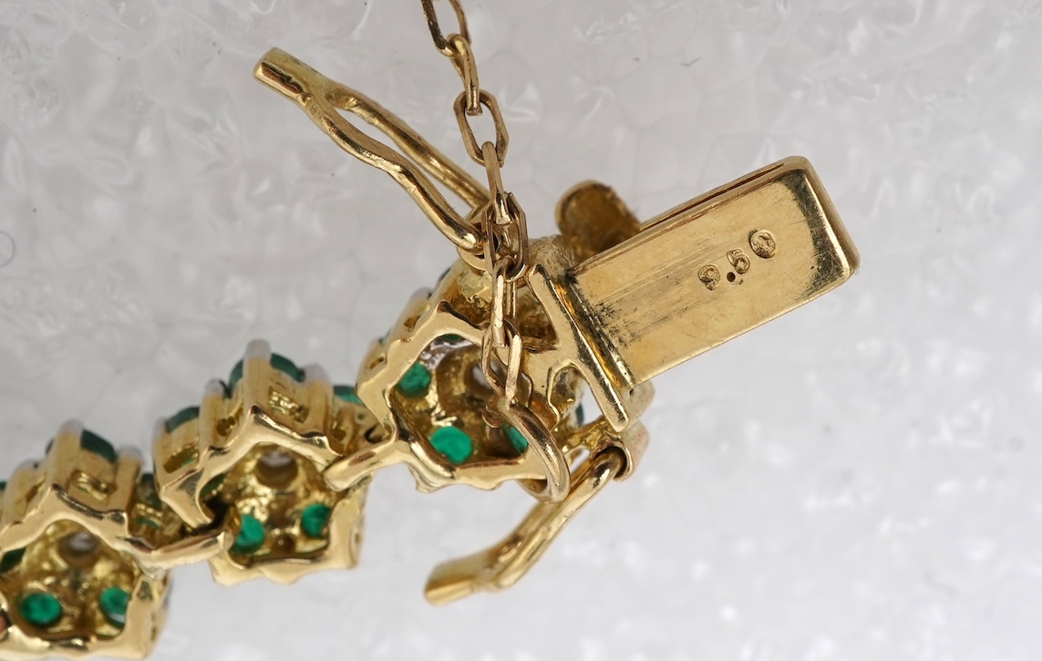An emerald and diamond bracelet, composed of links designed as clusters of brilliant-cut diamonds within borders of circular-cut emeralds, mounted in gold, length 17cm, stamped K18 750, D.1.55 and 9.50, gross weight 22 grams