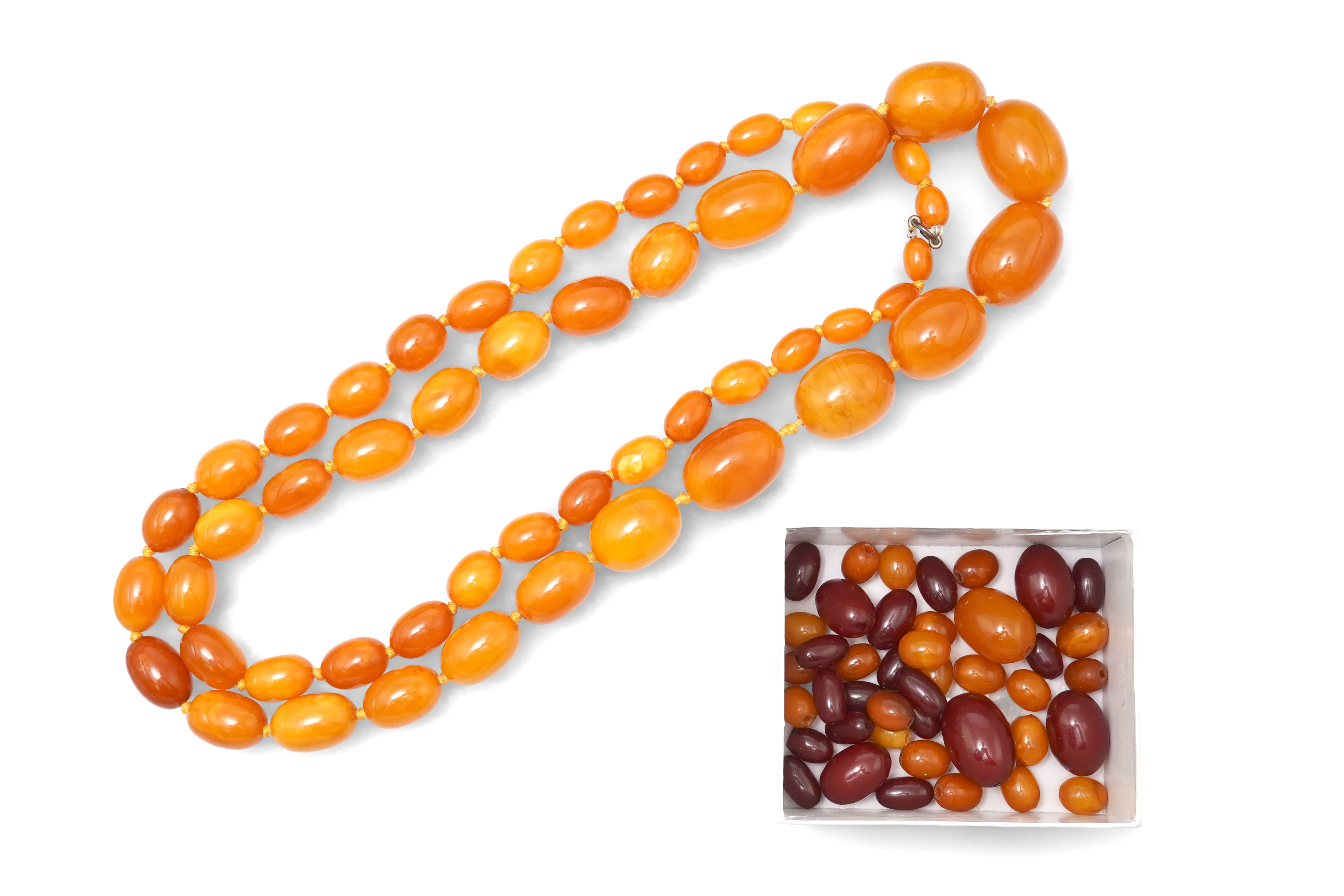 An amber necklace, composed of graduated oval beads measuring approximately 0.9-2.6cm, length approximately 100cm, gross weight approximately 115 grams, together with a box of amber and cherry bakelite 'amber' beads totalling approximately 35 grams