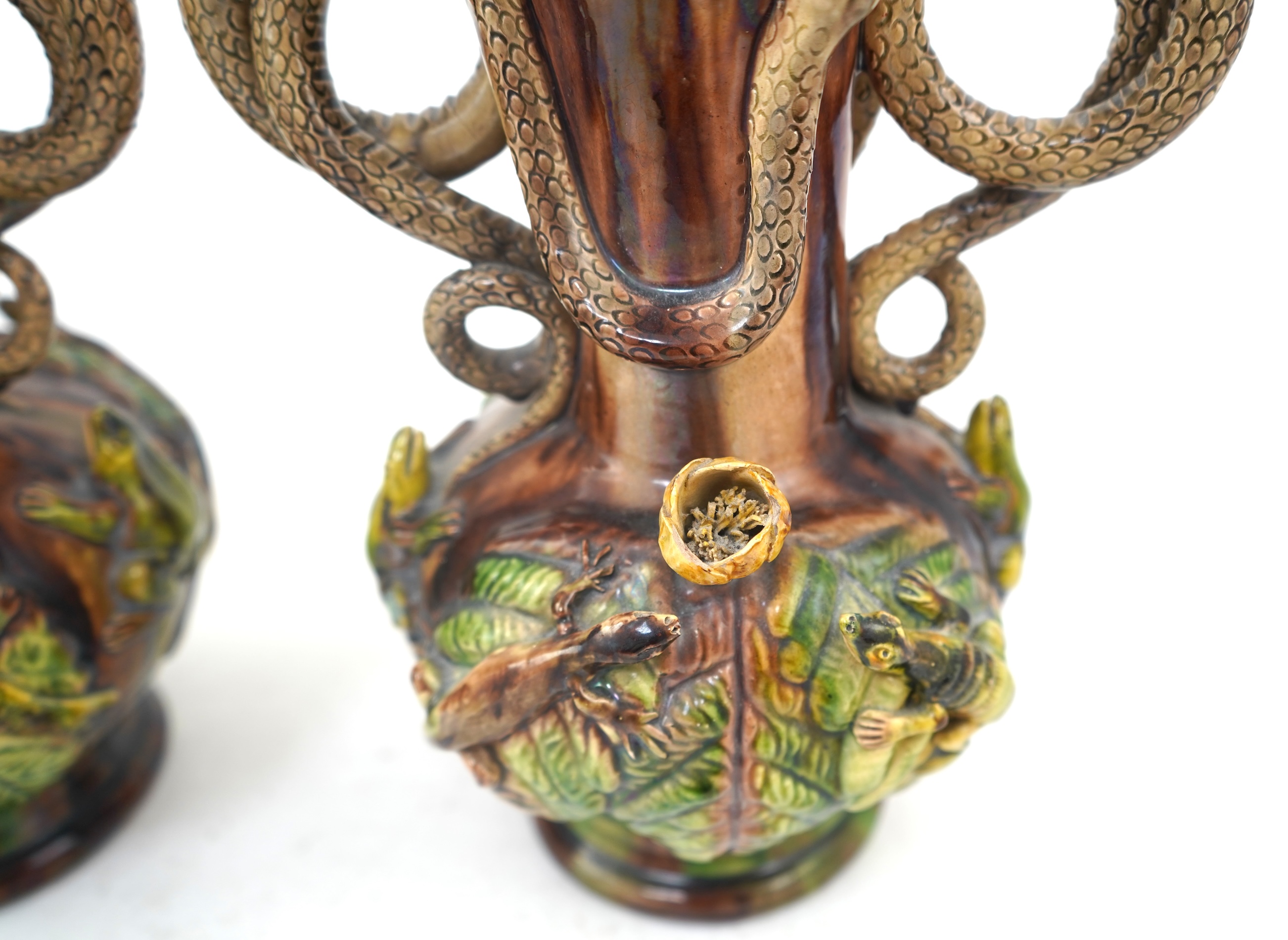 A pair of Palissy ware two handled vases, by Mafra Caldas Da Rainha, late 19th century, each modelled with entwined snakes to the neck, lizards and frogs on leaves to the body, apparently unmarked, 25.5cm high