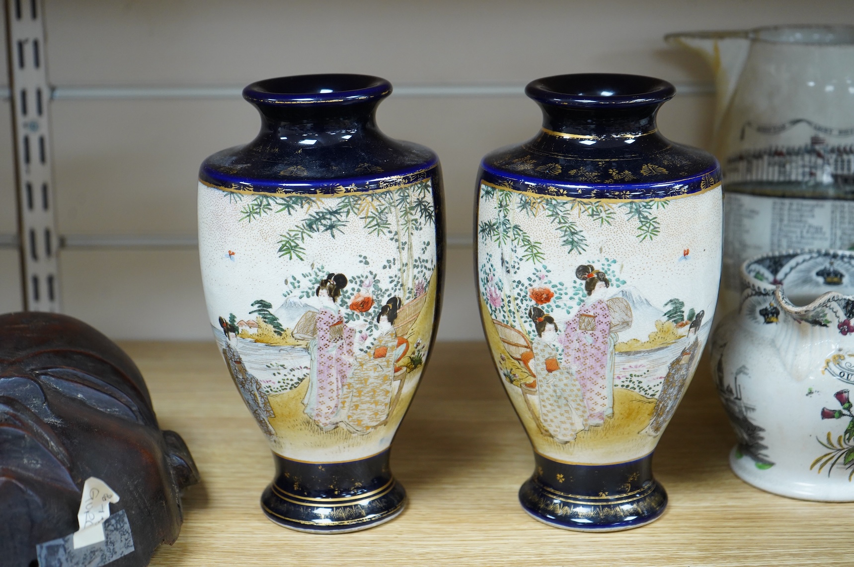 A late 19th century Chinese blue and white vase and cover and two Japanese Satsuma pottery vases, largest 24cm high