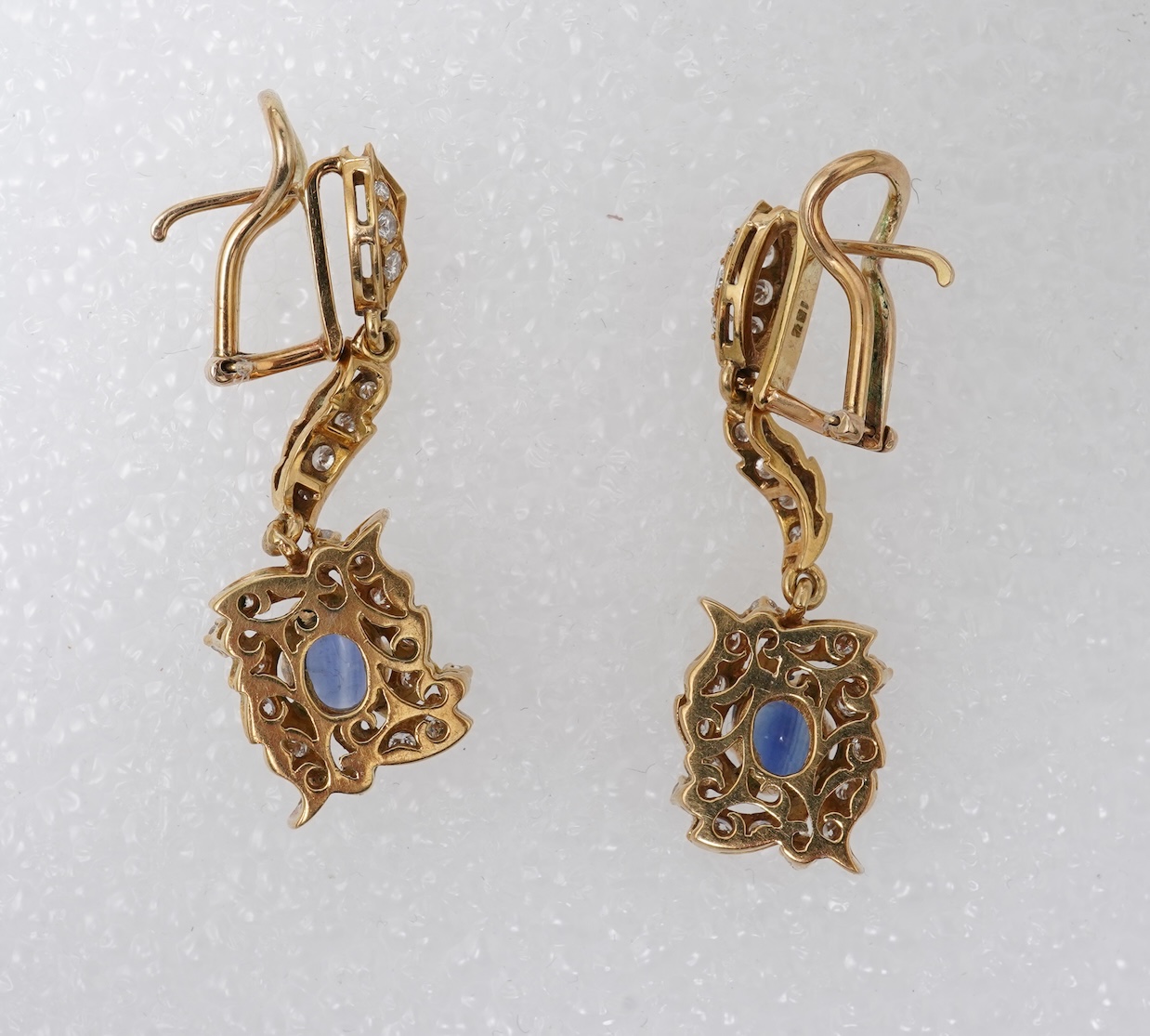 A pair of sapphire and diamond earrings, of pendent design, set with oval sapphires totalling approximately 1.50 carats and brilliant-cut diamonds totalling approximately 1.80 carats, in foliate gold settings, length 4.3cm each, clip and post fittings, stamped 18C, combined gross weight approximately 15.5 grams