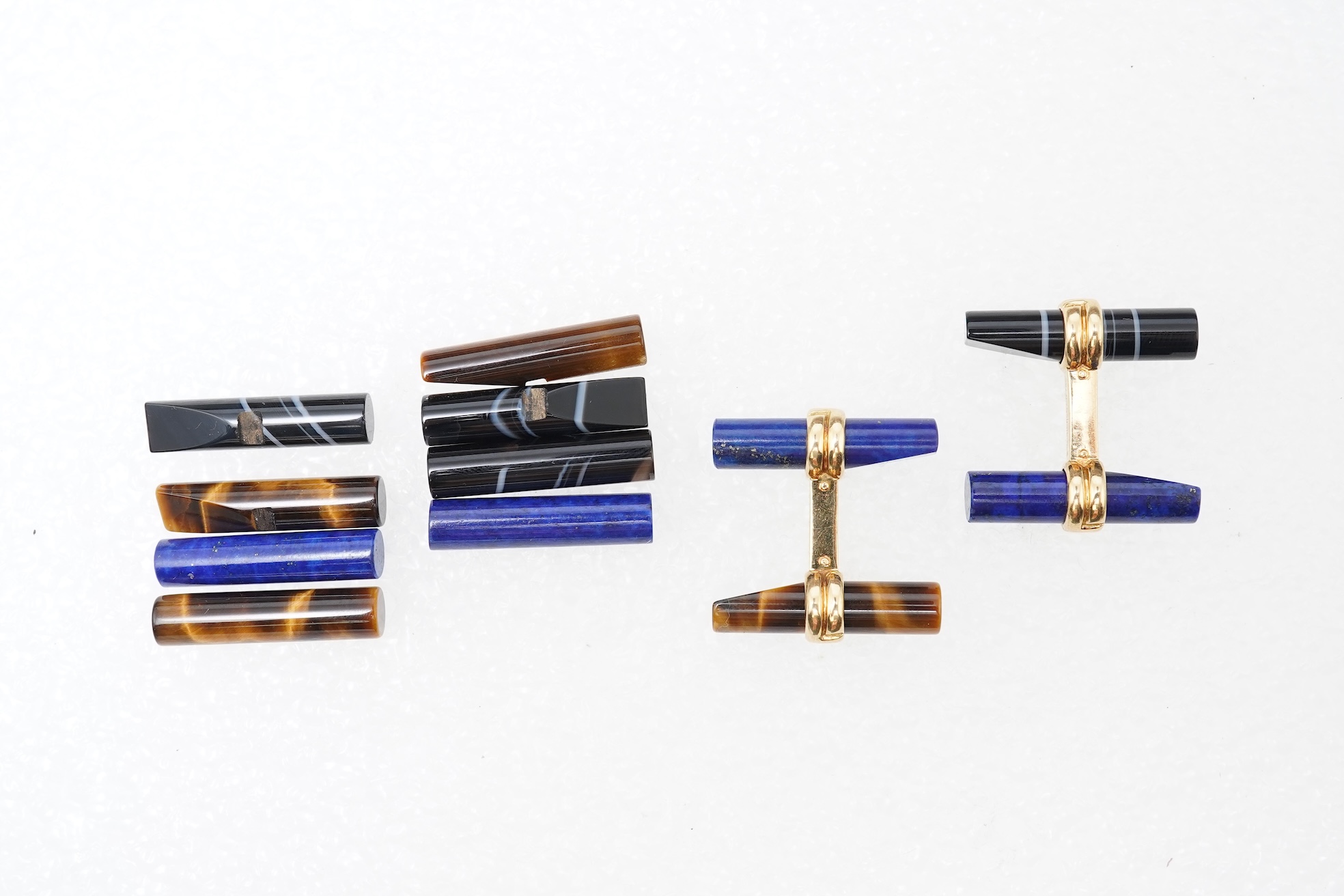 Boucheron, a pair of gold and hardstone cufflinks, each of bar design, each end terminating in a hoop, holding interchangeable batons of lapis lazuli, tiger's eye and onyx, in gold, each signed Boucheron, French assay marks for 18ct gold, French maker's mark for Boucheron, baton length 2.2cm each, fitted case stamped Boucheron