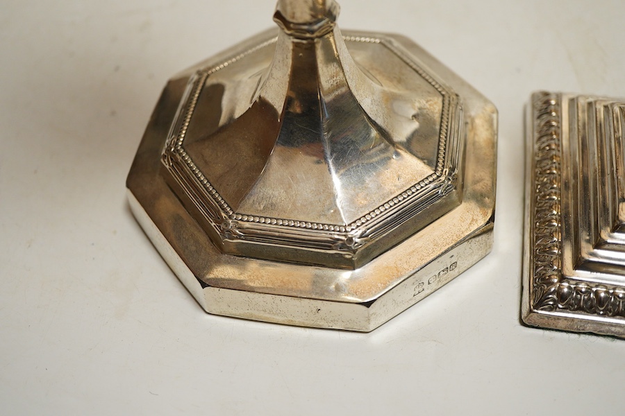 A George V silver candlestick, Sheffield, 1933, James Deakin & Sons, weight base together with a Victorian dwarf cluster column candlestick on stepped weighted base, (2) A George V silver candlestick, Sheffield, 1933, James Deakin & Sons, weight base together with a Victorian dwarf cluster column candlestick on stepped weighted base, (2)