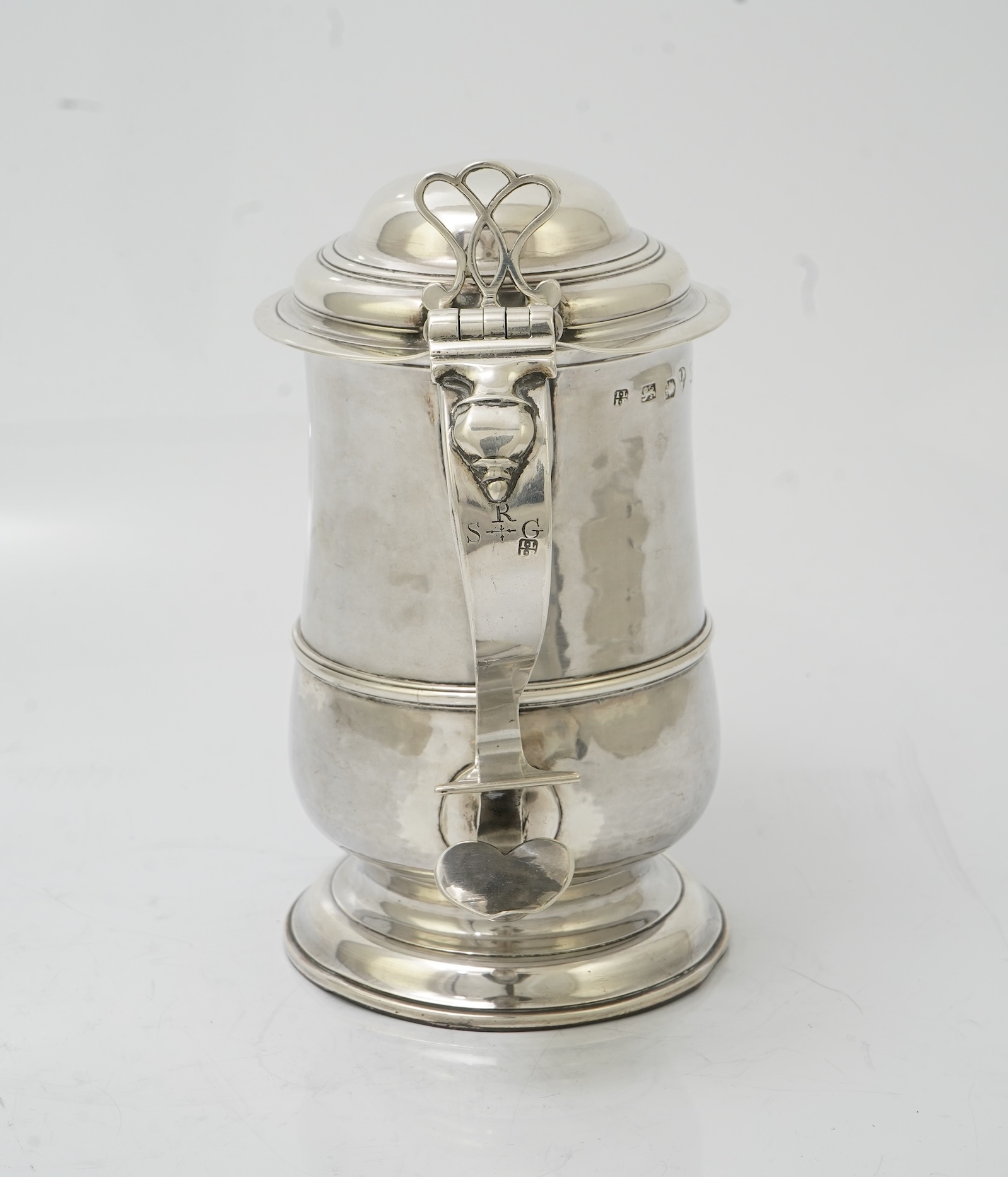 A George III provincial silver tankard with domed hinged cover, by John Langlands I and John Robertson I, with banded girdle, scroll handle and pierced thumbpiece, Newcastle, 1788, height 19.9cm, the base with copper insert?, gross weight 24.1oz.