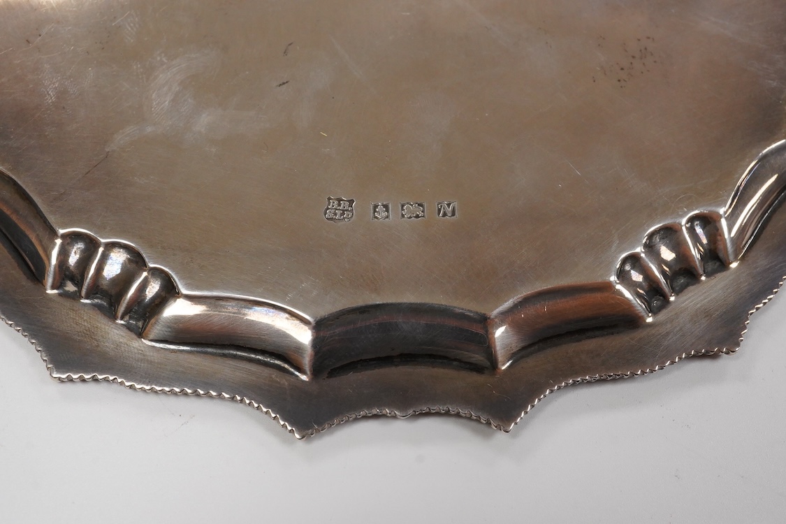 Lot 1848 , An Elizabeth II silver salver, of shaped circular form wit gadrooned border, on three hoof feet, Barker Brothers Silver Ltd, Birmingham, 1962, diameter 20.6cm, 11.1oz.