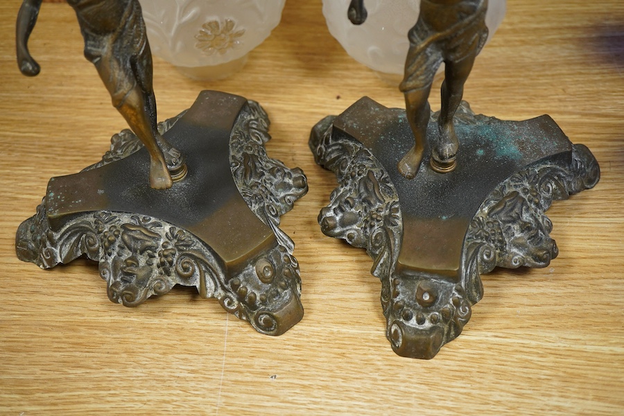 A pair of brass figural lamps with frosted glass shades, 47cm high
