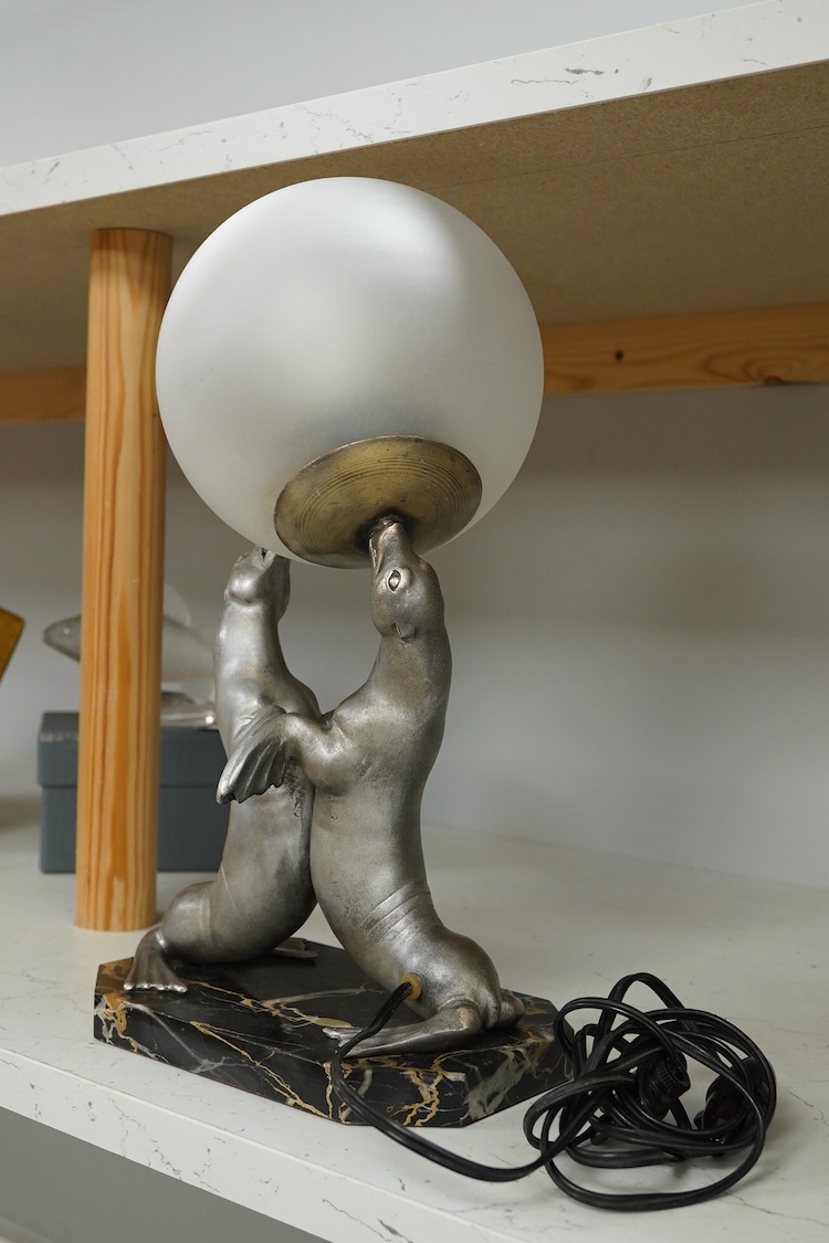Lot 1364 , After Louis Carvin (French, 1875-1951) a twin seal lamp with circular frosted glass shade, 34cm high