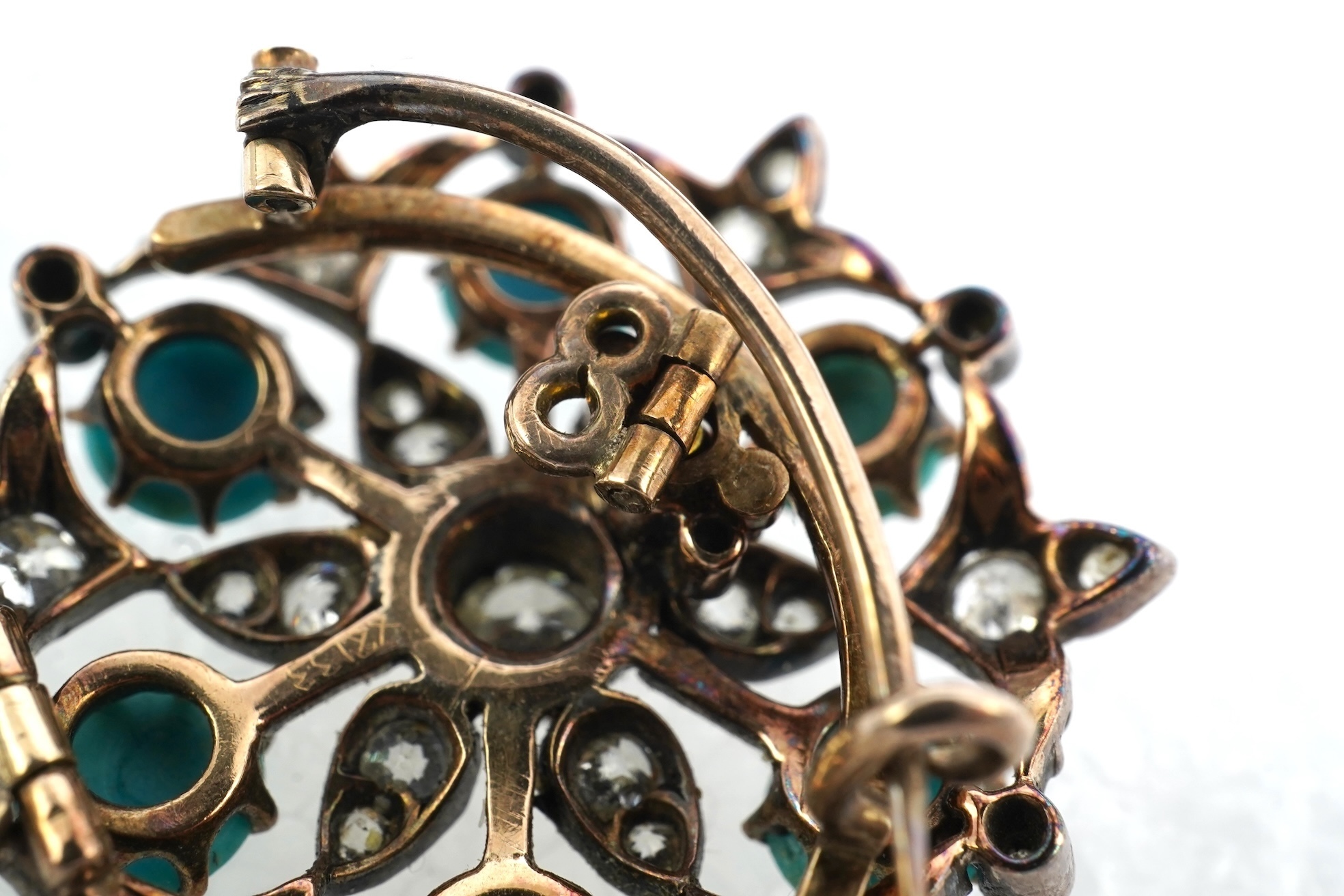 A Victorian diamond and turquoise pendant brooch, late 19th century, designed as an openwork floral cluster, set with turquoise cabochons and circular-cut diamonds totalling approximately 0.90 carats, mounted in silver and gold, length approximately 3.6cm including detachable bail, brooch fittings detachable, gross weight approximately 7.5 grams