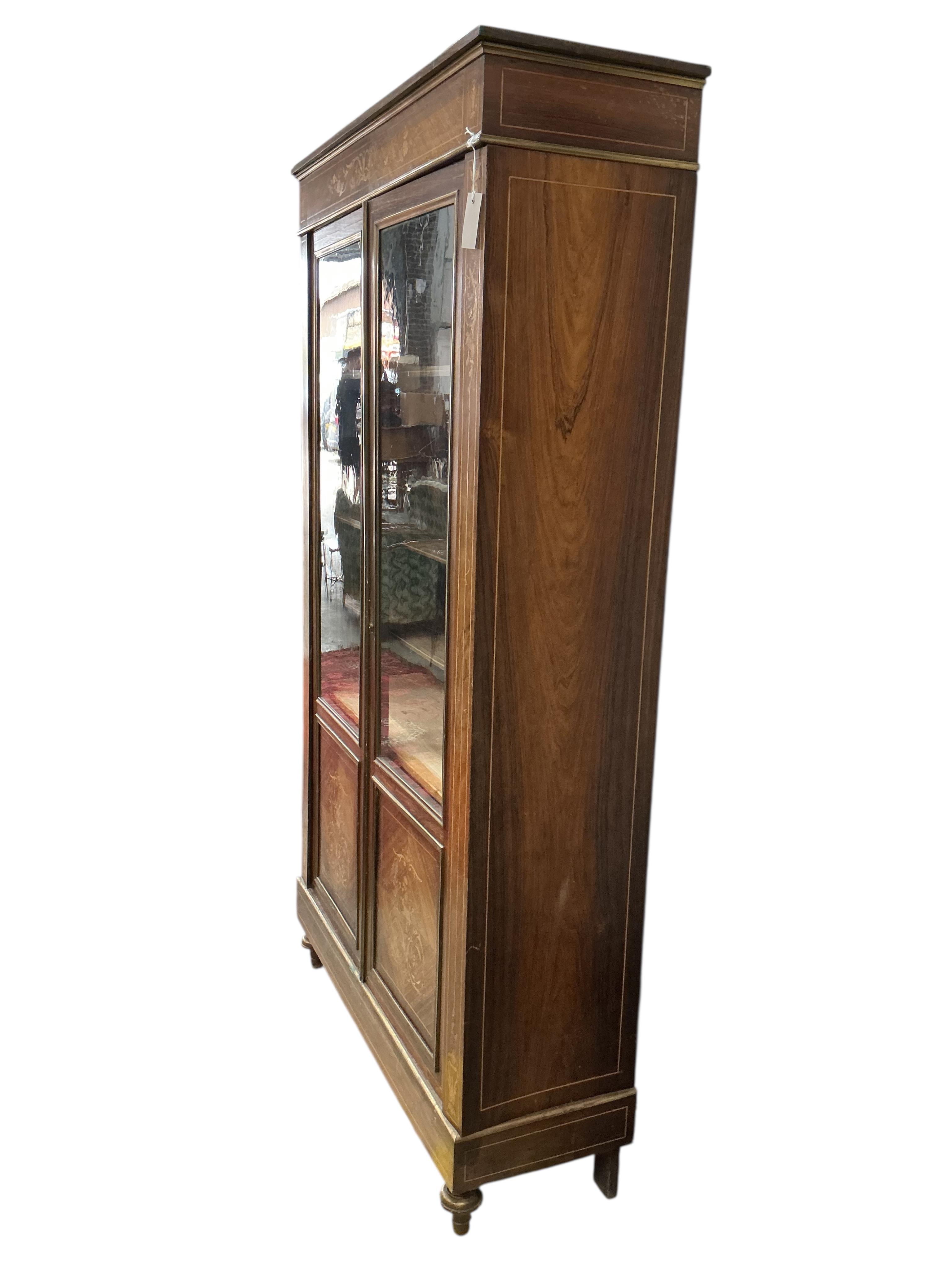 An early 20th century French brass mounted marquetry inlaid rosewood bookcase, width 104cm, depth 35cm, height 187cm