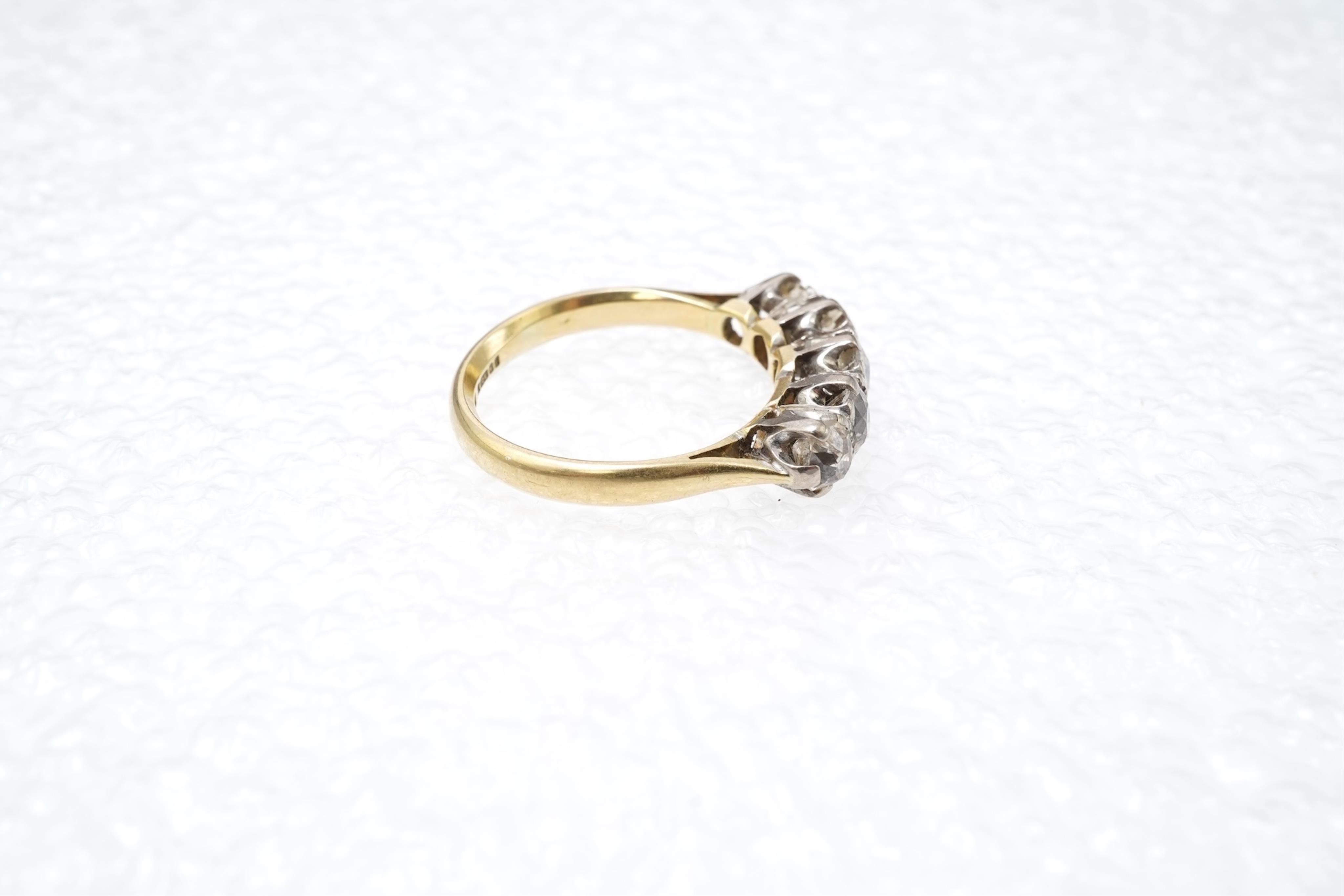A diamond five-stone ring, early 20th century, claw-set with a sequence of five circular-cut diamonds totalling approximately 0.90 carats, mounted in 18ct gold, size M, British hallmarks, gross weight approximately 4.4 grams