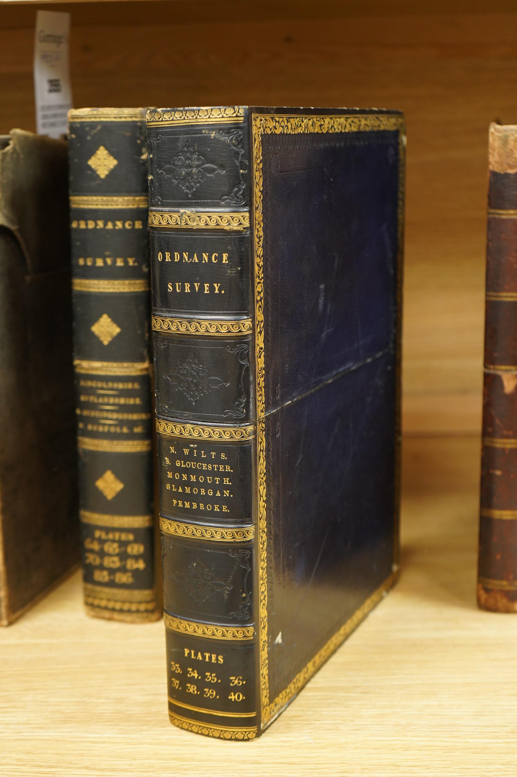 Ordnance Survey maps, comprising of a set of eight engraved maps mounted on linen and each edged with blue cotton, covering N. Wiltshire, S. Gloucester, Monmouth, Glamorgan, and Pembroke, sheet no.s; 36, 37, 38, 39, 40, 41, 42 and 43, engraved by Benjamin Baker at the Ordnance Map Office in the Tower, and published by Lt. Col. Colby, of the Royal Engineers, dated 1833, in a leather slip case with lid and gilt tooling, disguised as a book