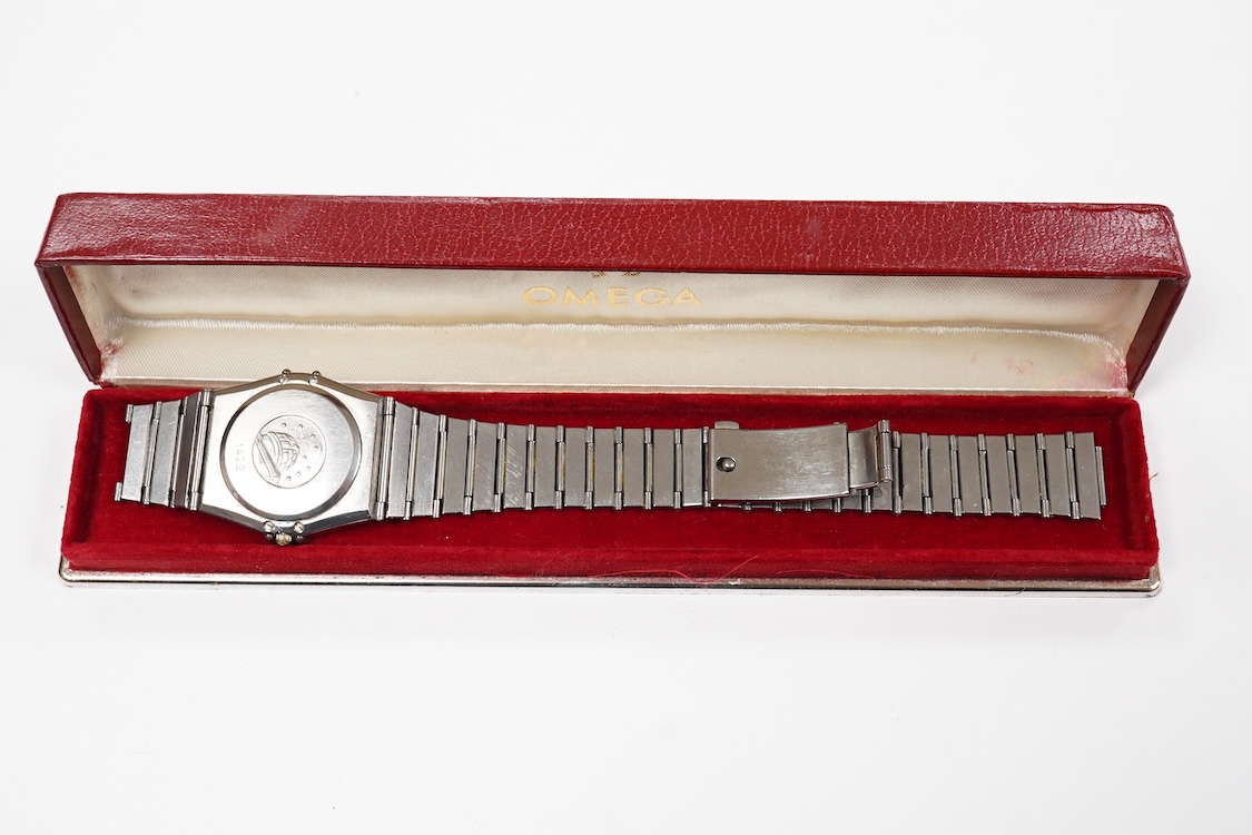 Lot 1904 , A gentleman's recent stainless steel Omega Constellation Chronometer quartz wrist watch, with Roman dial and date aperture, case diameter 34mm, on a stainless steel Omega bracelet, with Omega box, no papers, (a.f.).