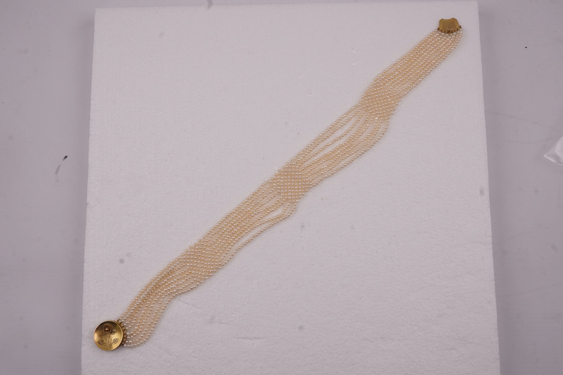 A pearl necklace with gold clasp, late 19th century and later, the circular gold clasp depicting a poppy, the reverse with a glazed locket compartment, to a pearl collar of eight strands, woven into three panels, length approximately 34cm, gross weight approximately 35 grams, pearls untested, possibly later