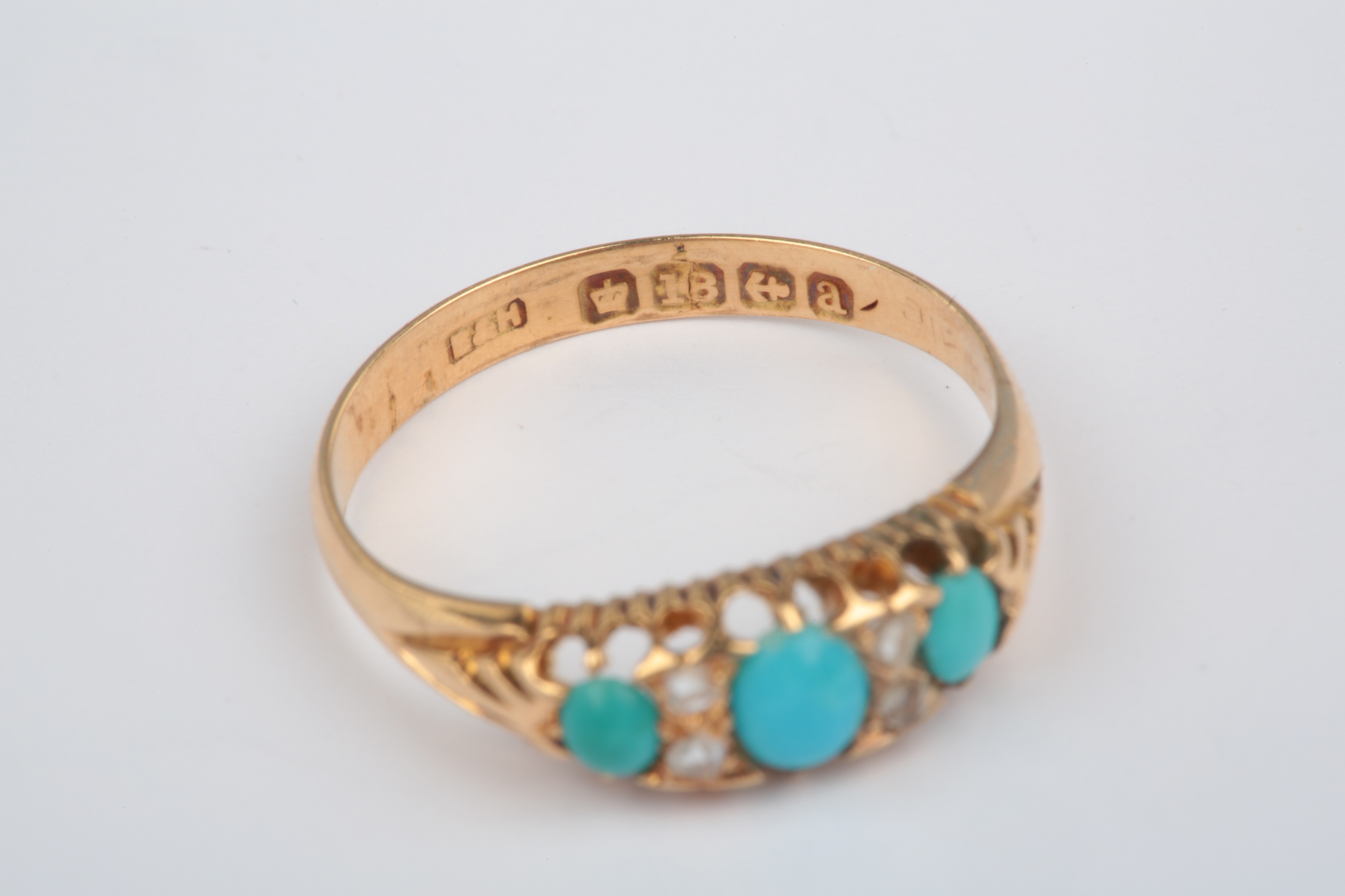 A turquoise and diamond ring, circa 1900, set with three turquoise cabochons, spaced by pairs of rose-cut diamonds, mounted in 18ct gold, size M, British hallmarks, sponsor's mark B&H, gross weight approximately 2 grams