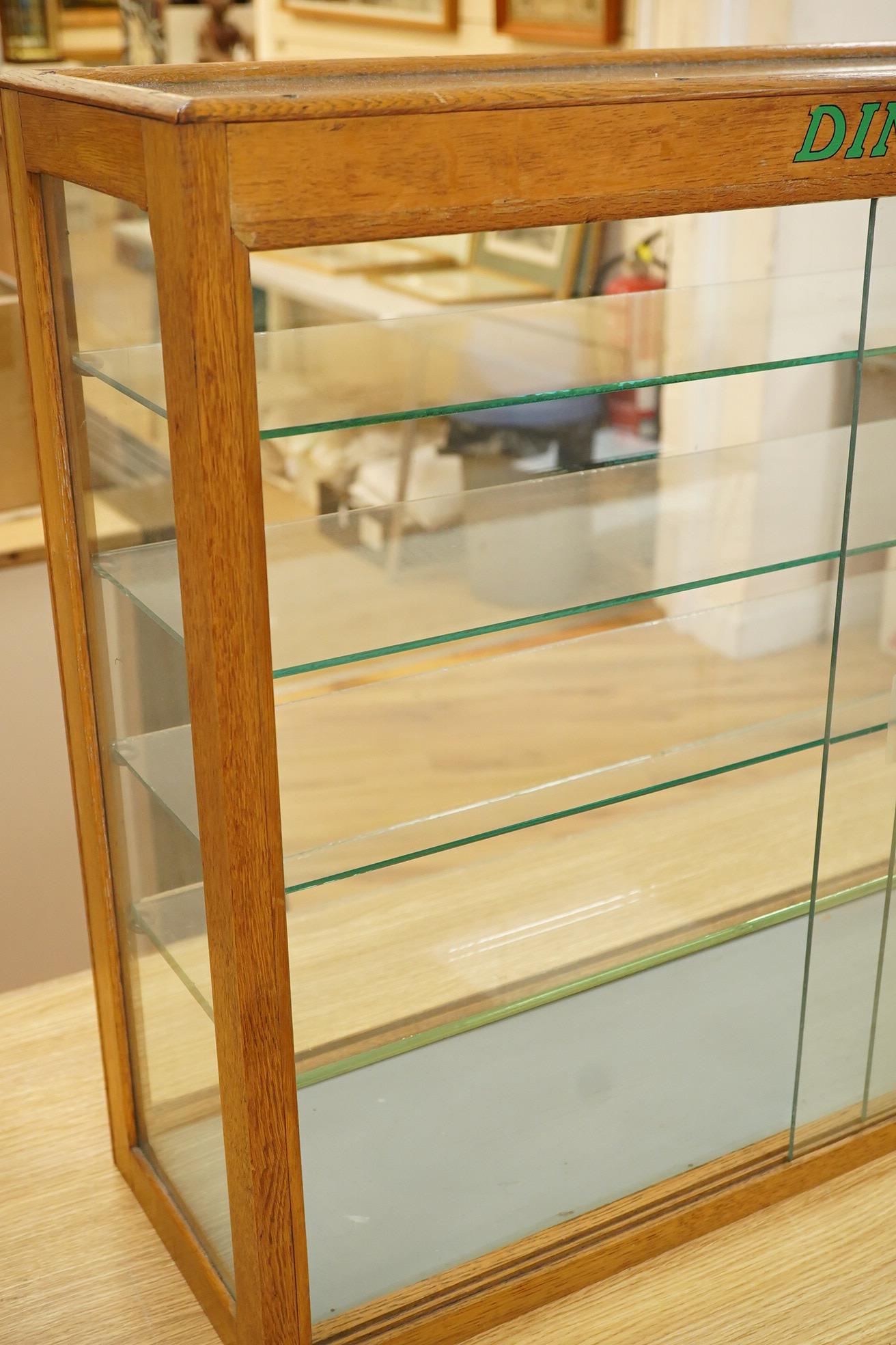 A Dinky Toys glazed oak shop counter retail display cabinet, this is the more scarce ‘front loading’ version of this cabinet, with ‘Dinky Toys’ in green to the top bar, height 61cm, width 81cm, depth 23cm