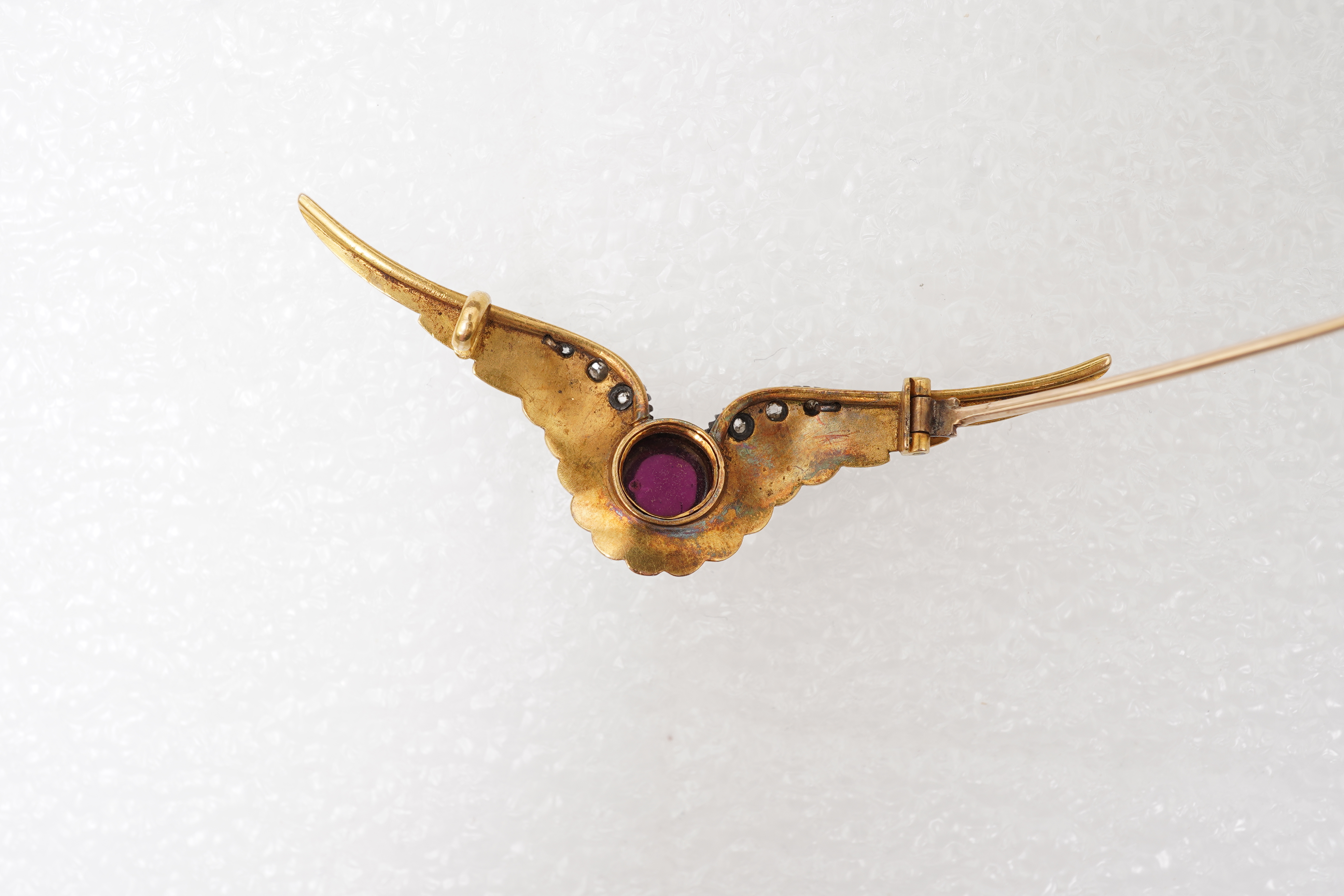 Carlo and Arthur Giuliano, a Victorian enamel, garnet and diamond brooch, late 19th century, designed as a pair of outstretched wings in green basse taille enamel, accented with cushion-shaped diamonds, centring on a cabochon garnet, mounted in silver and gold, length 6.2cm, signed C&AG, gross weight approximately 6 grams, original fitted tooled leather case stamped C&A Giuliano, 115 Piccadilly London