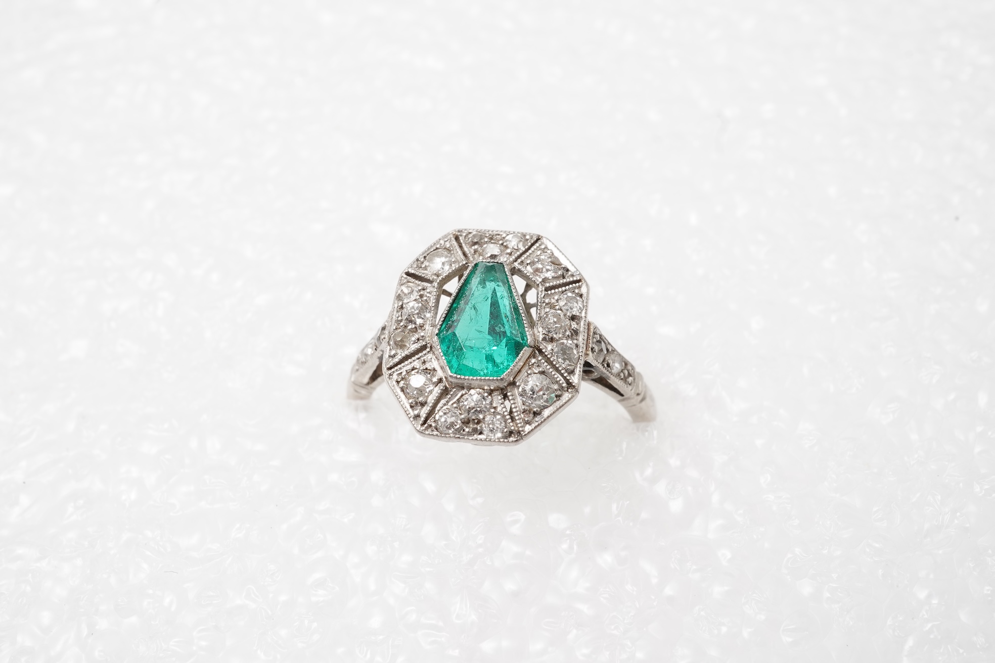 An Art Deco emerald and diamond ring, circa 1930, set with a shield-shaped emerald measuring approximately 7.3 x 5.1 x 4mm, within an octagonal border and shoulders set with circular-cut diamonds totalling approximately 0.50 carats, millegrain-set in platinum, gross weight approximately 4.5 grams