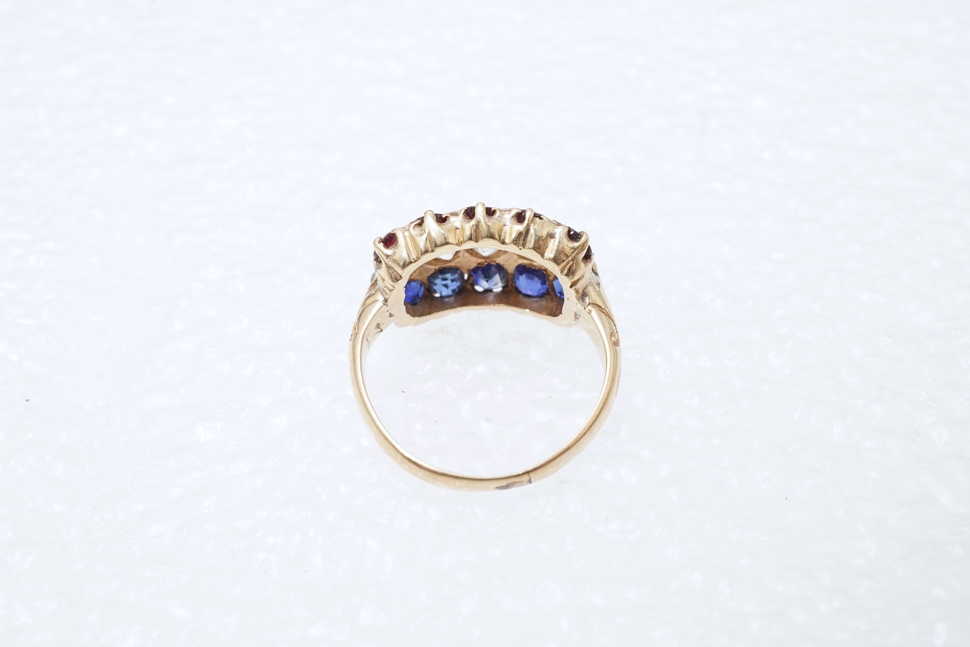 A ruby, sapphire and diamond ring, late 19th century, set with a sequence of circular-cut diamonds totalling approximately 0.35 carats, between bands of cushion-shaped sapphires and rubies, mounted in gold, size K, indistinctly marked, gross weight approximately 4.4 grams