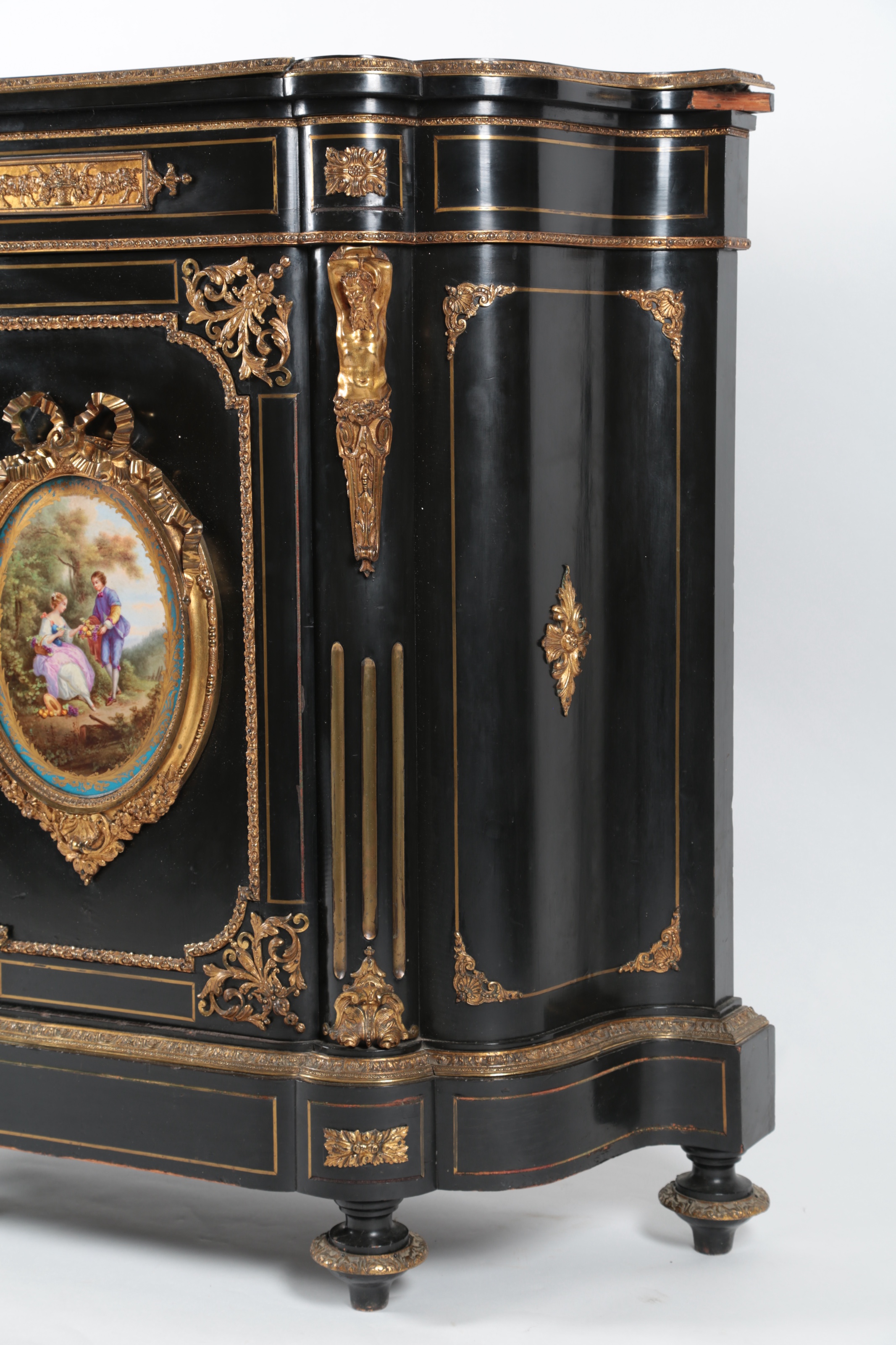 the central door inset oval Sevres style porcelain plaque within a ribbon-fold border flanked by cast caryatid, on turned feet, 125cm wide, 43cm deep, 127cm high