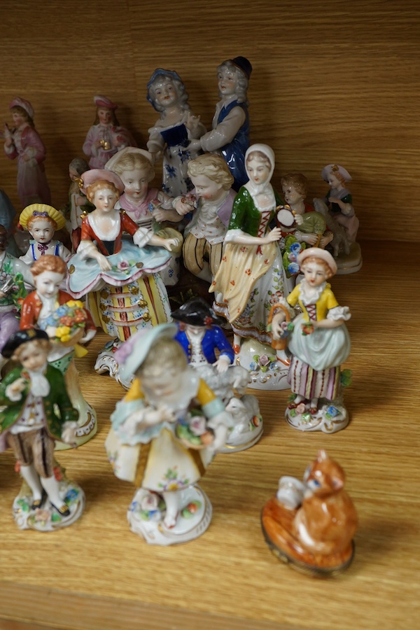 A group of german porcelain figures to include Sitzendorf, together with a Limoges pill box in the form of a cat, largest 17cm high