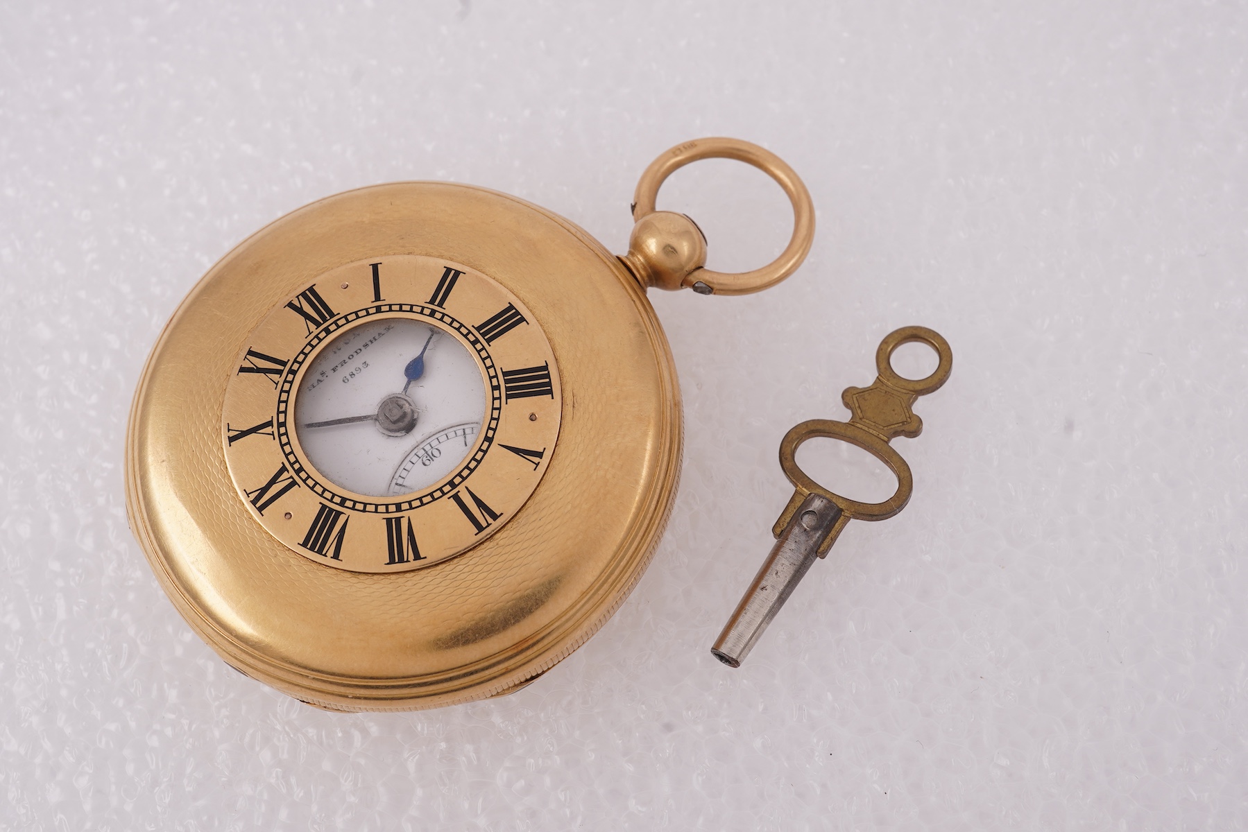 A late Victorian 18ct gold keywind half hunter lever pocket watch by A.R. Arnold, Chas. Frodsham, 84 Strand, London, with enamelled Roman chapter ring and Roman dial with subsidiary seconds, the case back with red enamel monogram, the signed three quarter plate movement numbered 6893, case diameter 45mm, gross weight 81.4 grams, with key.