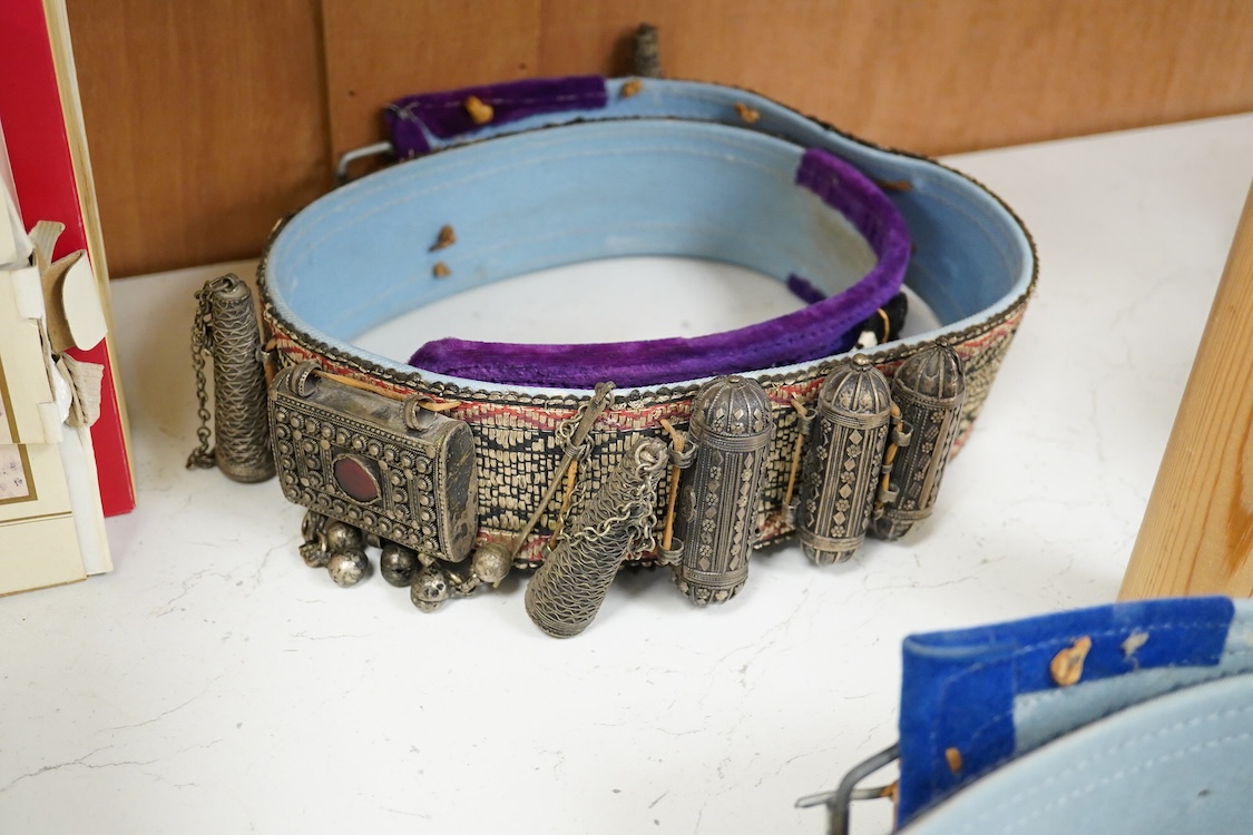Two Yemeni white metal daggers white and two belts, largest dagger 31cm long
