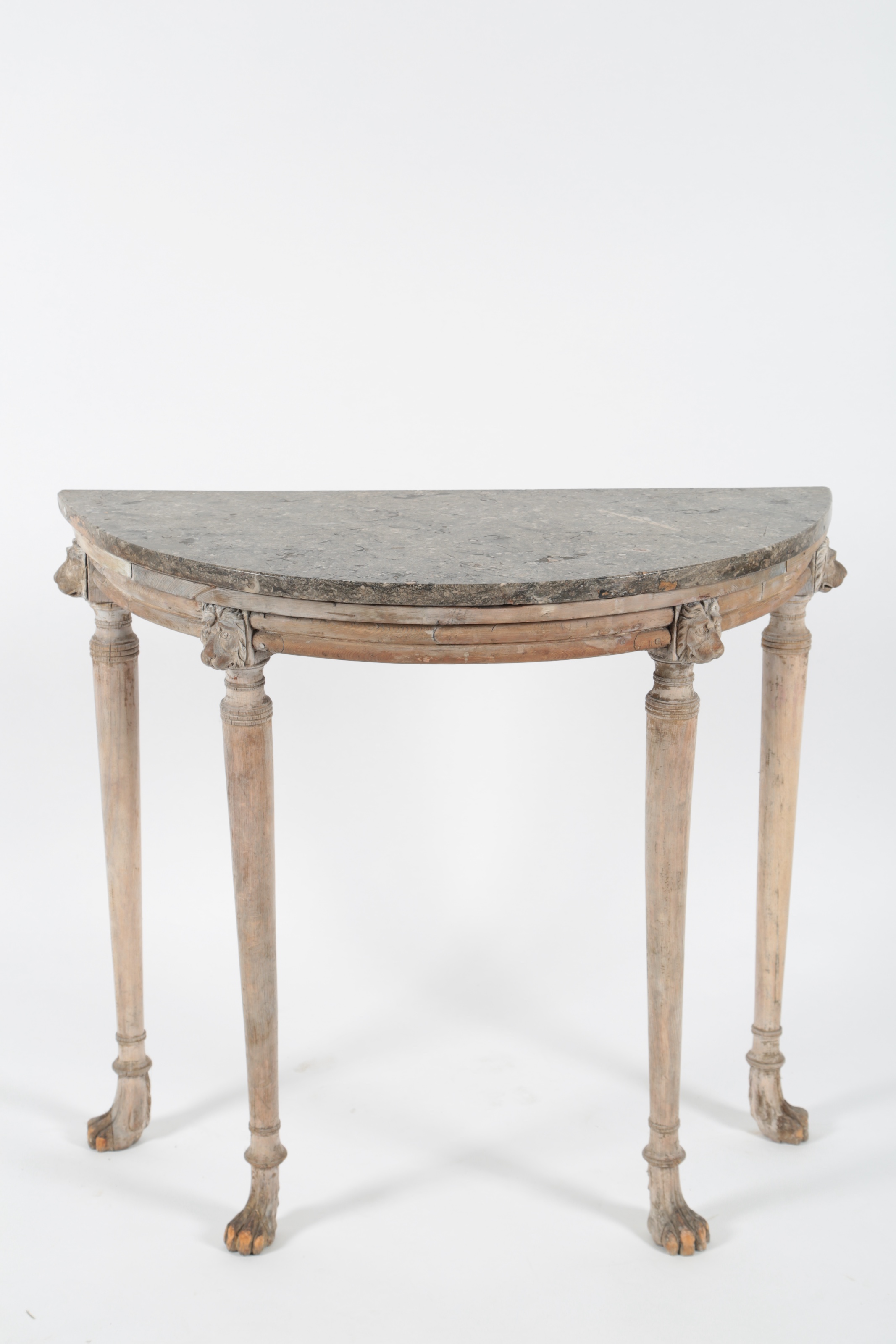 on four tapering cylindrical legs headed by lion masks, on lion paw feet, 95cm wide, 33cm deep, 85cm high