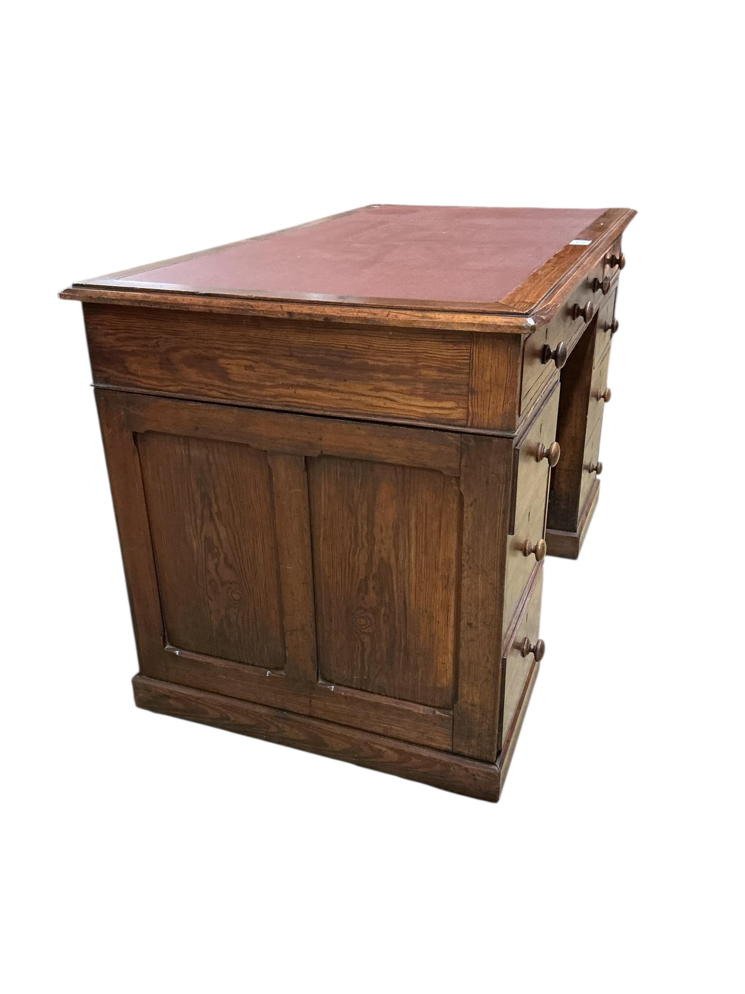 Lot 65 , An early 20th century pitch pine pedestal desk, width 124cm, depth 69cm, height 74cm