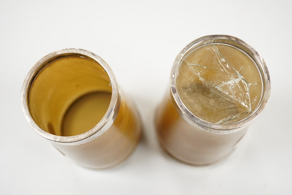 A pair of late Victorian silver mounted horn beakers, Thomas Johnson II, London, 1879, 13.4cm, (a.f.).