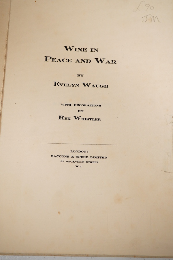 ° Waugh, Evelyn - Wine in Peace and War... 2 coloured pp. of text decorations (by Rex Whistler); original coloured pictorial boards (by Rex Whistler). Saccone and Speed Limited, (194); sold with: De Stein, E. - The Poets in Picardy and Other Poems. half title; original cloth and d/wrapper, cr. 8vo. 1919. (2)