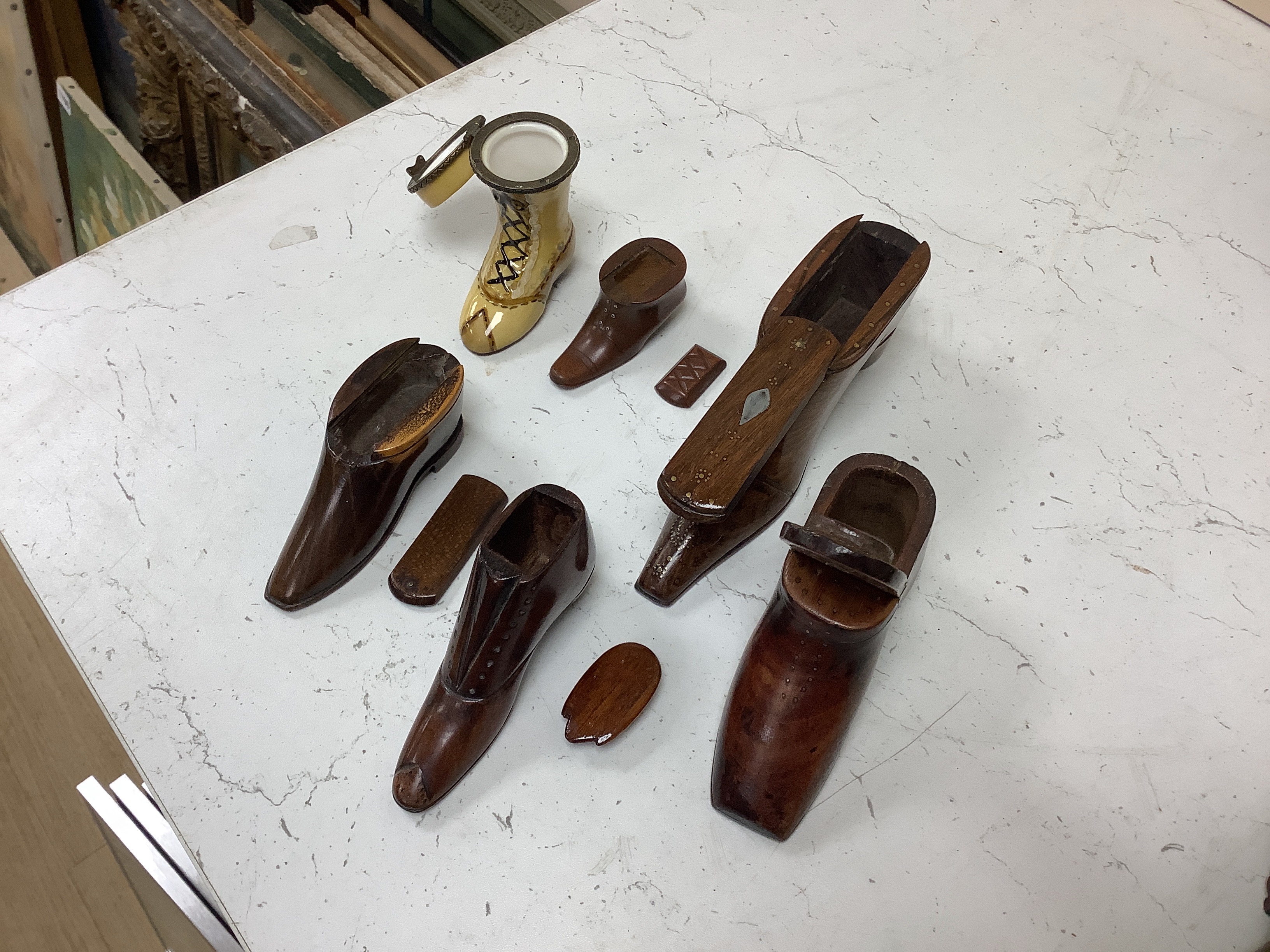 Four 19th century carved mahogany boot snuff boxes, largest 15cm, and other miscellaneous boot and shoe ornaments