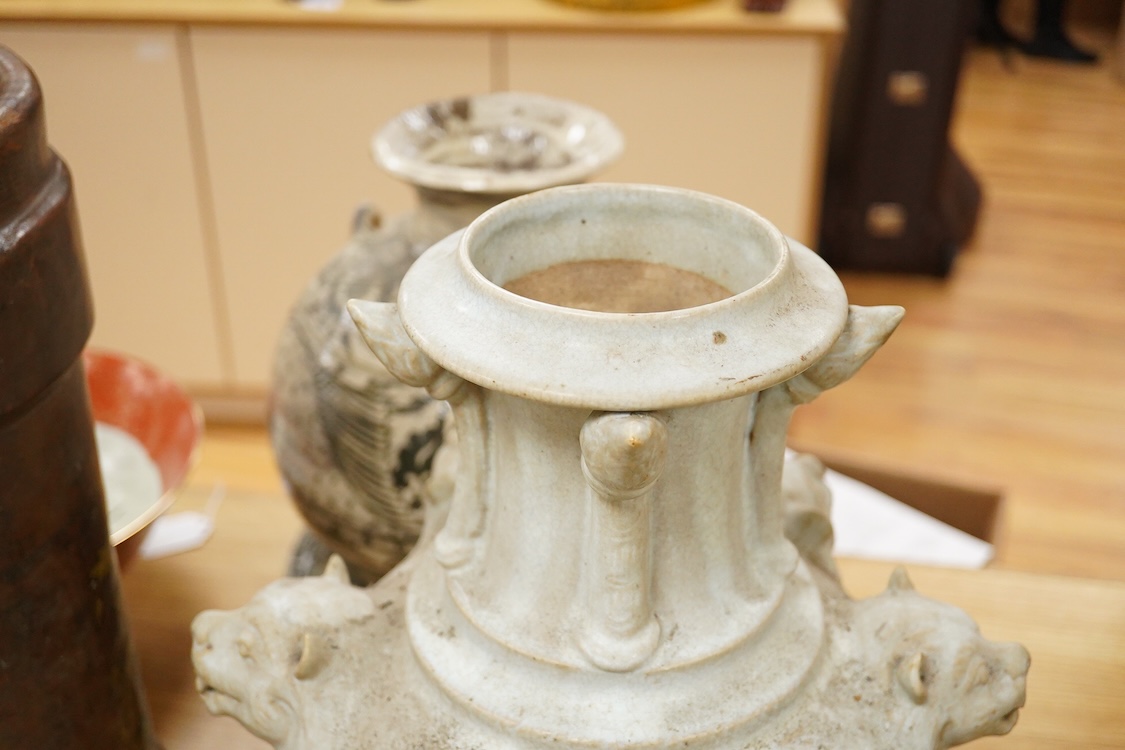 Lot 423 , A large Thai pale blue glazed jar decorated with panther masks, 47cm