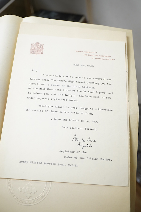 A WWII medal group comprising of the 1939-1945 star, the Atlantic star, the Burma star with Pacific clasp, the defence medal, the 1939-1945 with oak leaf, together with an unrelated miniature set, plus a cased MBE awarded to Henry W. Emerton Esq. with its original outer card box, the miniature, the letter and certificate from Buckingham Palace, and the instruction leaflet for wearing the insignia, a First World War medal pair awarded to 148374 SPR. J.W. Howard. R.E., and a few other items