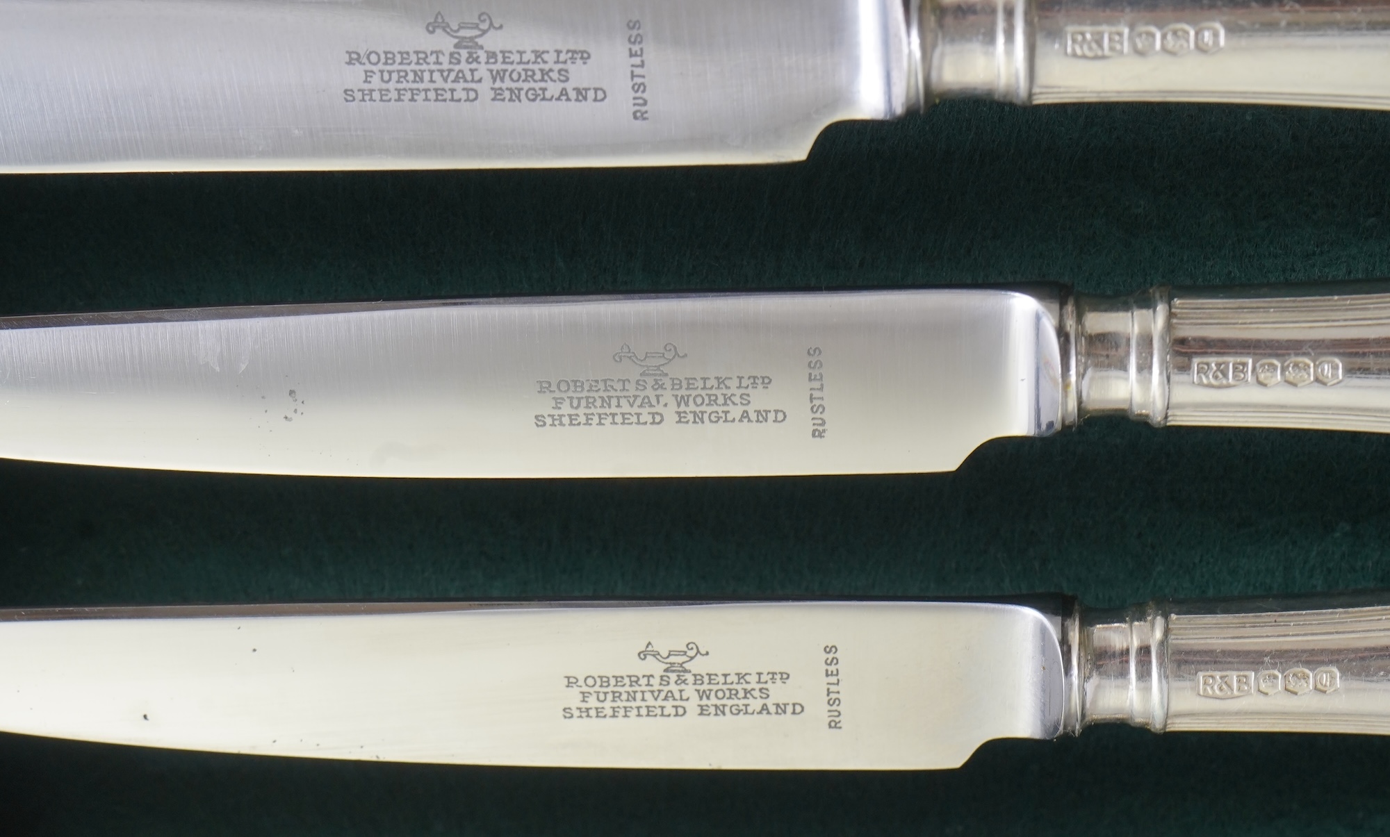 A canteen of Elizabeth II silver cutlery for eight by Roberts & Belk, comprising eight table forks, eight dessert forks, eight dessert spoons, eight soup spoons, eight teaspoons, eight pairs of silver fish eaters, eight silver handled steel table knives, eight silver handled steel dessert knives, four silver serving or table spoons and a three piece silver handled steel carving set, Sheffield, 1973, weighable silver 88.3oz, housed in a fitted canteen.