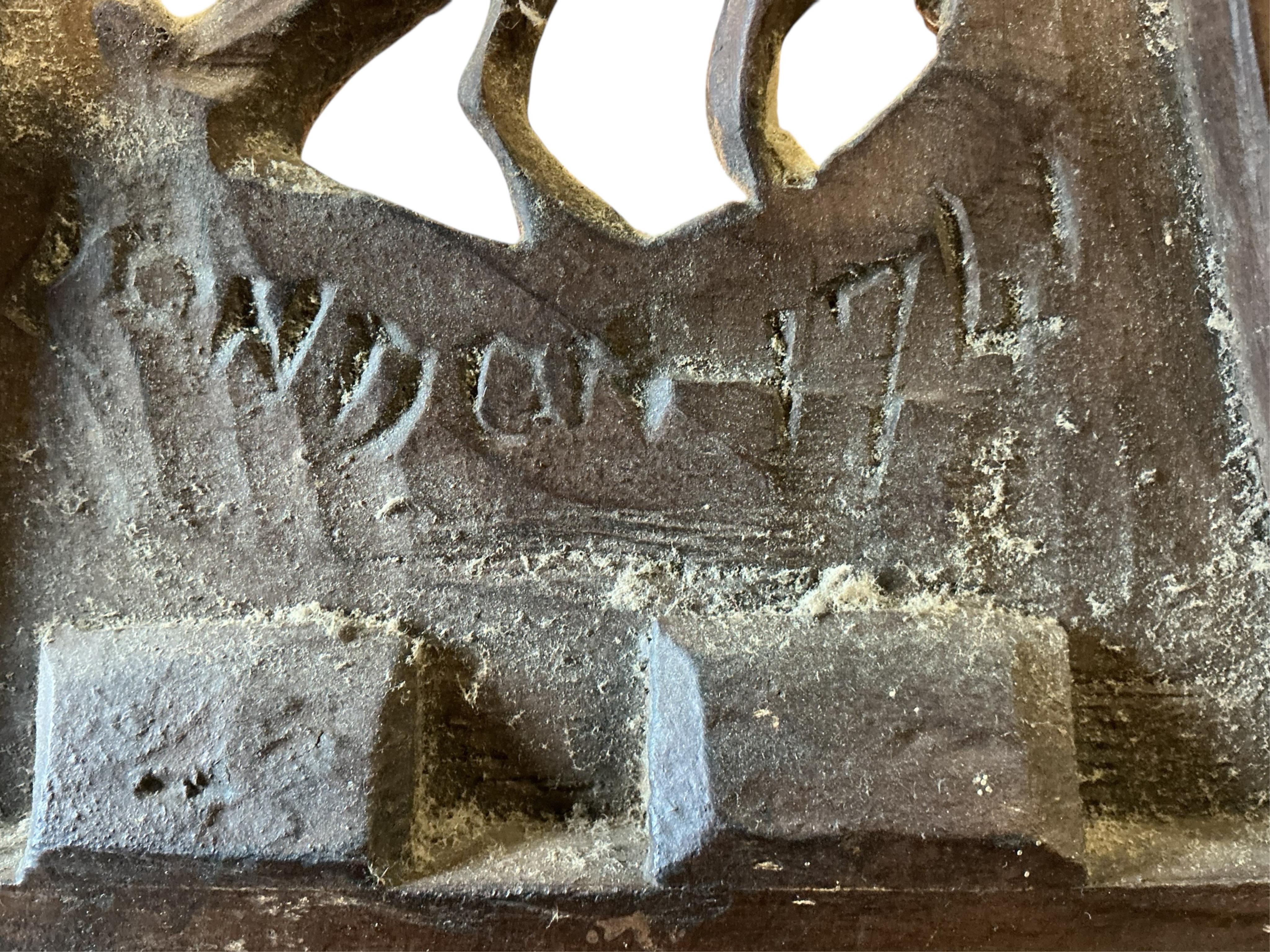 Lot 1007 , An 18th century style walnut and parcel gilt fret cut wall mirror, signed London, 1741, width 42cm, height 78cm