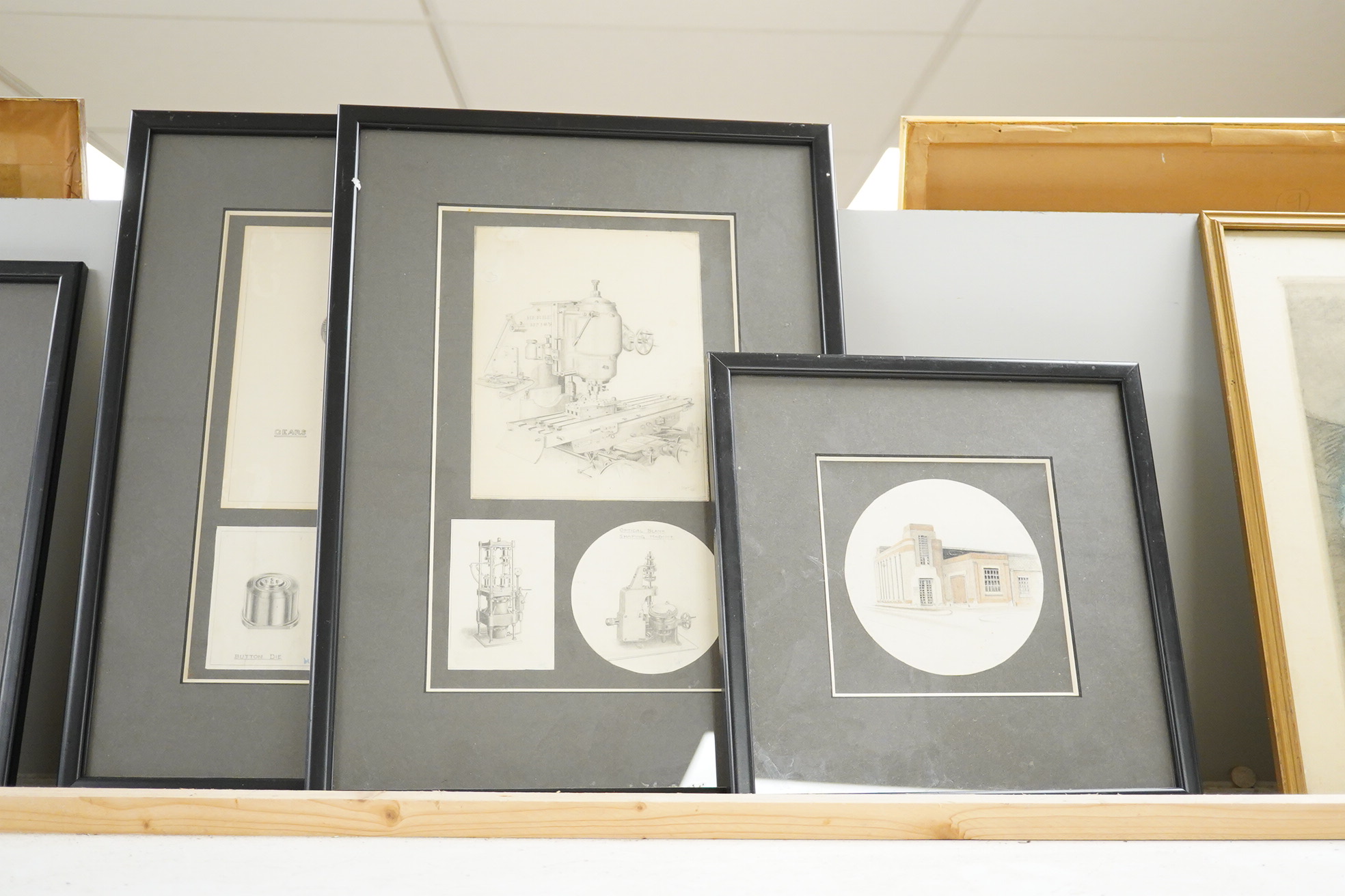 A collection of finely executed watercolour and pencil drawings, some technical subjects to include an accelerometer and Optical Blank Shaping Machine, framed as five, largest overall 40 x 29cm