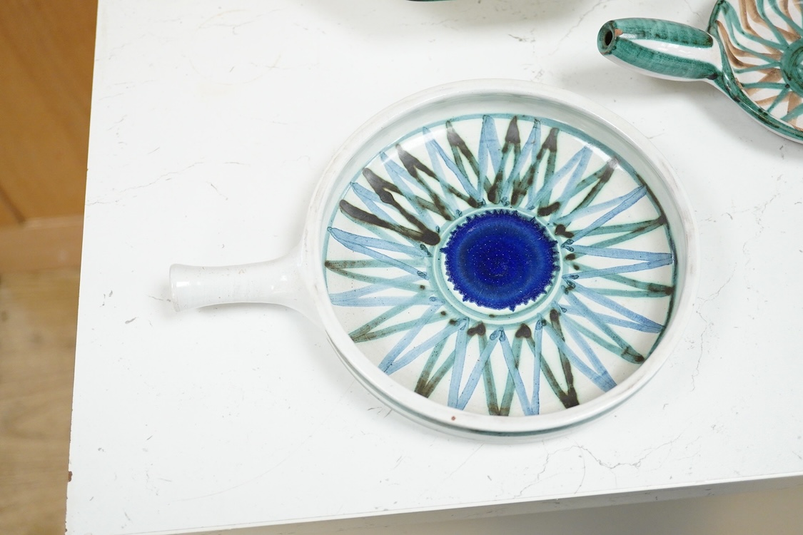 Robert Picault (French, 1919-2000), a Vallauris studio pottery dish and two handled dishes, larger dish 23.5cm