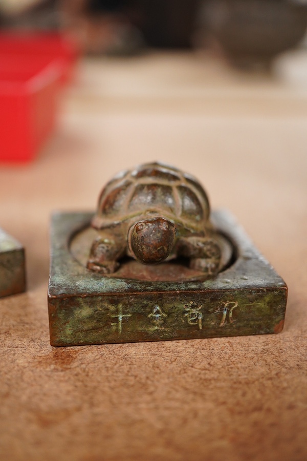 Three Chinese bronze seals comprising an elephant, tortoise and seared elder, largest 4.5cm square