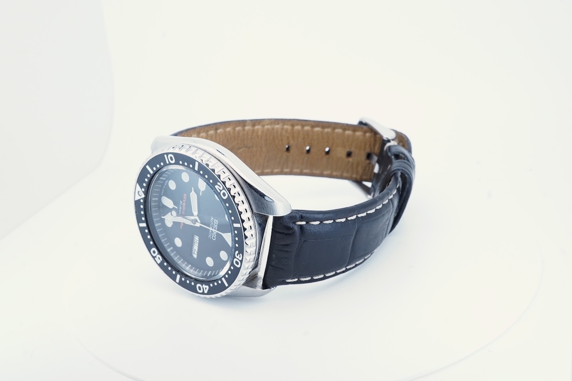 A gentleman's recent stainless steel Seiko Automatic Divers 200m wrist watch, with black dial and day/date aperture, the day in English and Japanese, case diameter 40mm, the case back numbered 4DO896, on a lack leather strap, no box or papers.
