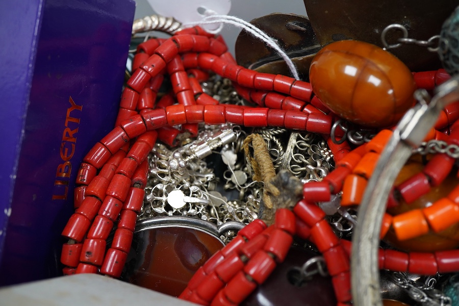 A collection of silver and costume jewellery, including an agate pendant in silver; an imitation coral necklace; a pair of silver ear clips designed as stylised wings, stamped MEXICO; a silver brooch modelled as a giraffe; another modelled as fish among seaweed; a Mohammed V coin pendant; and an assortment of other silver and costume jewels