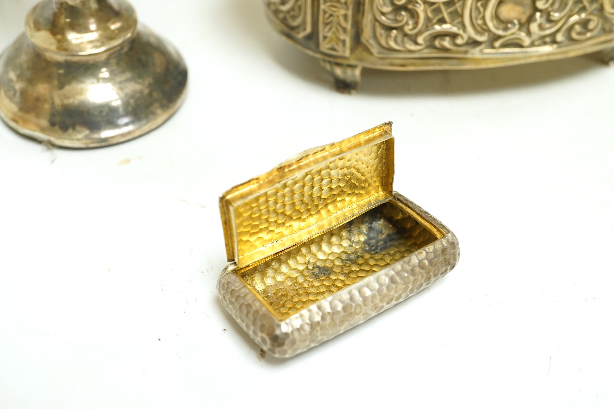 A late Victorian embossed silver oval trinket box, with hinged cover, William Harrison Walter, Birmingham, 1896, 11.8cm, together with a small silver dish, a silver mounted spill vase, heart shaped tortoiseshell dish(a.f.) and a French white metal pill box.