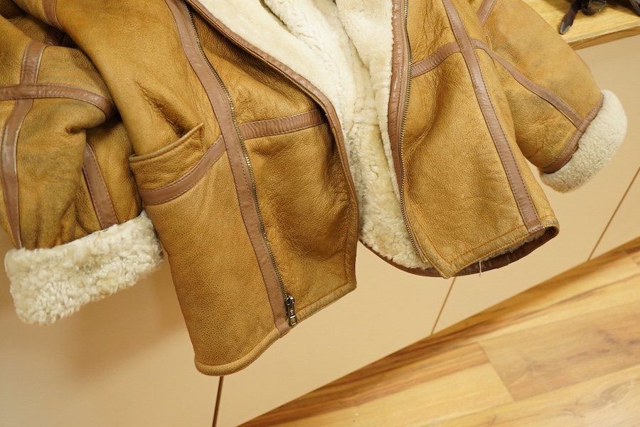 A sheepskin flying jacket, with label reading ‘42’, possibly a men’s medium or large size, together with a military leather flying cap, with faded label marked; ‘large’