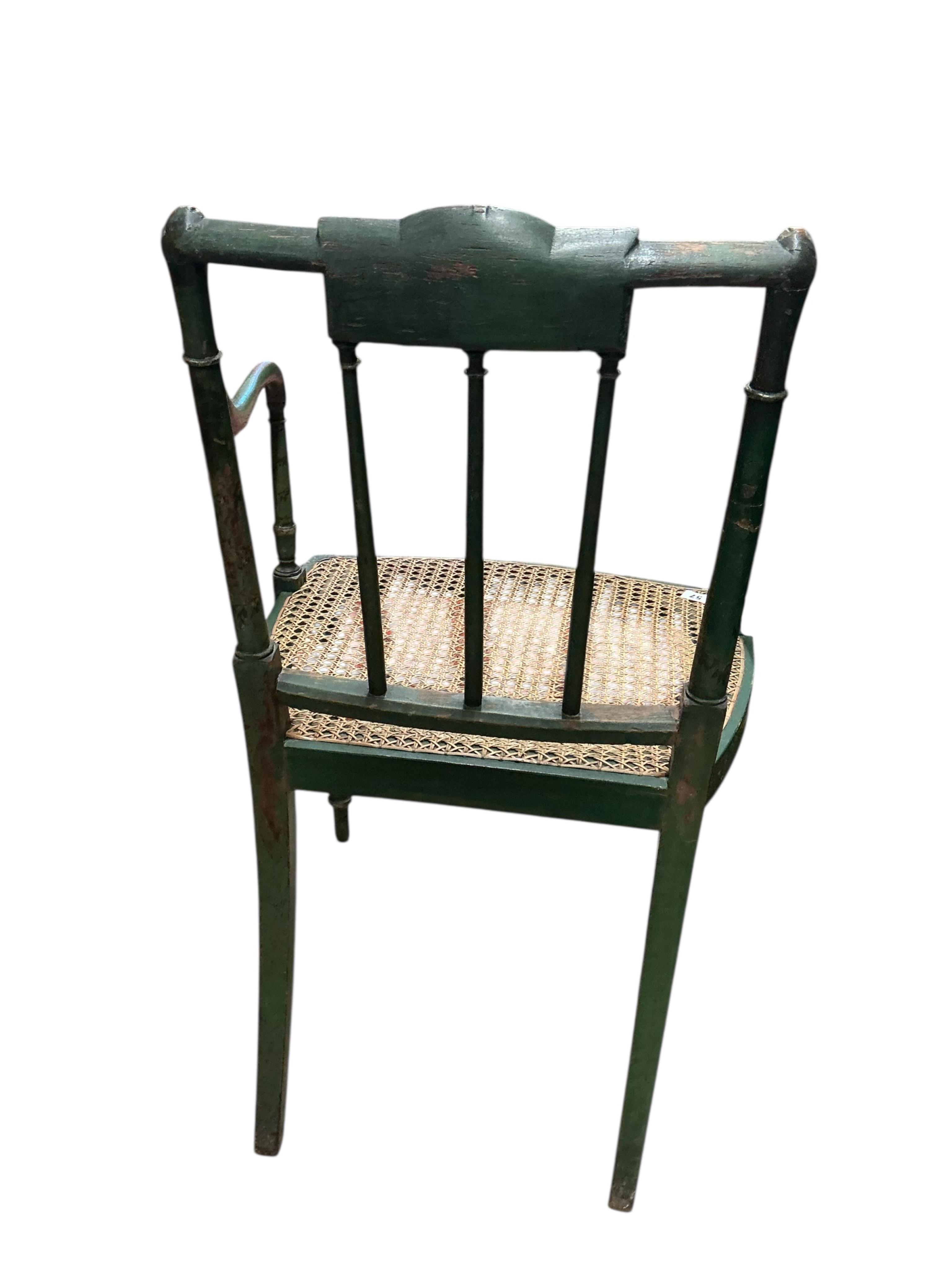 An early 19th century Sheraton style painted, cane seat elbow chair, width 56cm, depth 47cm, height 90cm
