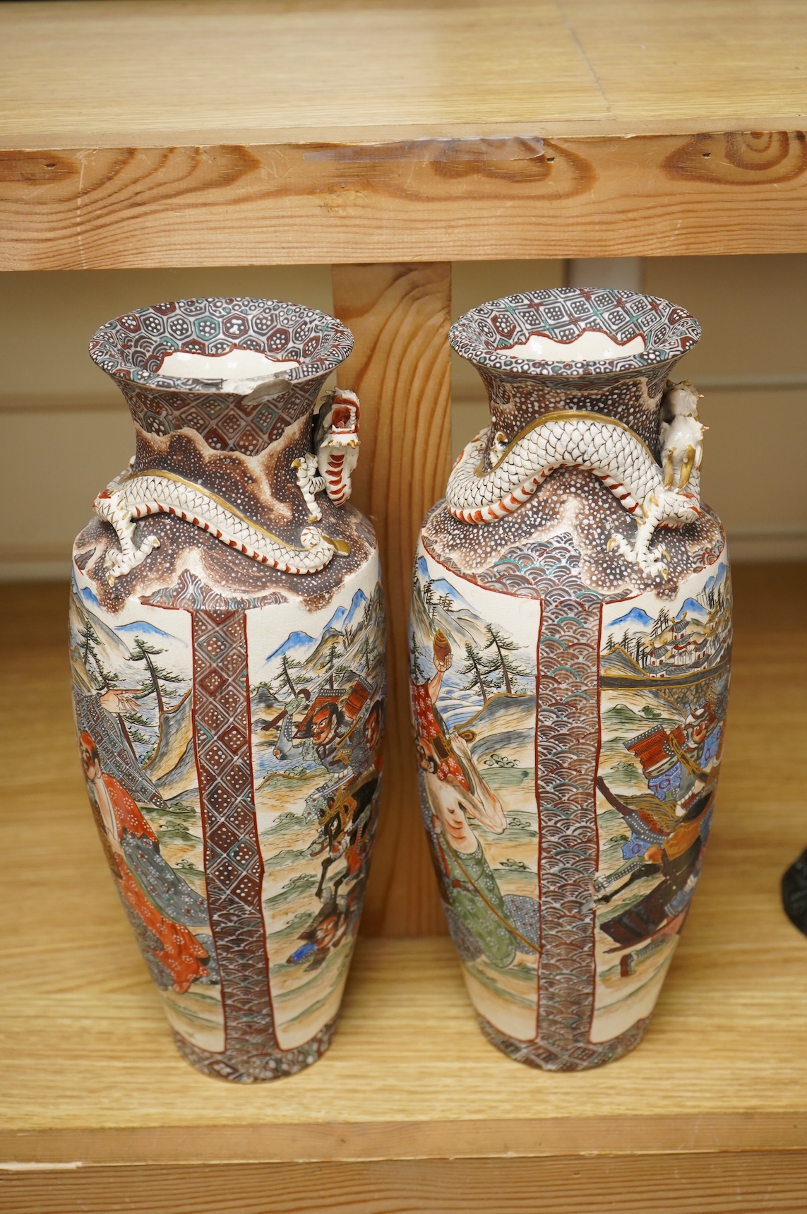Lot 255 , A pair of Japanese Satsuma ‘warrior’ vases, Meiji period, each neck modelled with a dragon, 31cm high