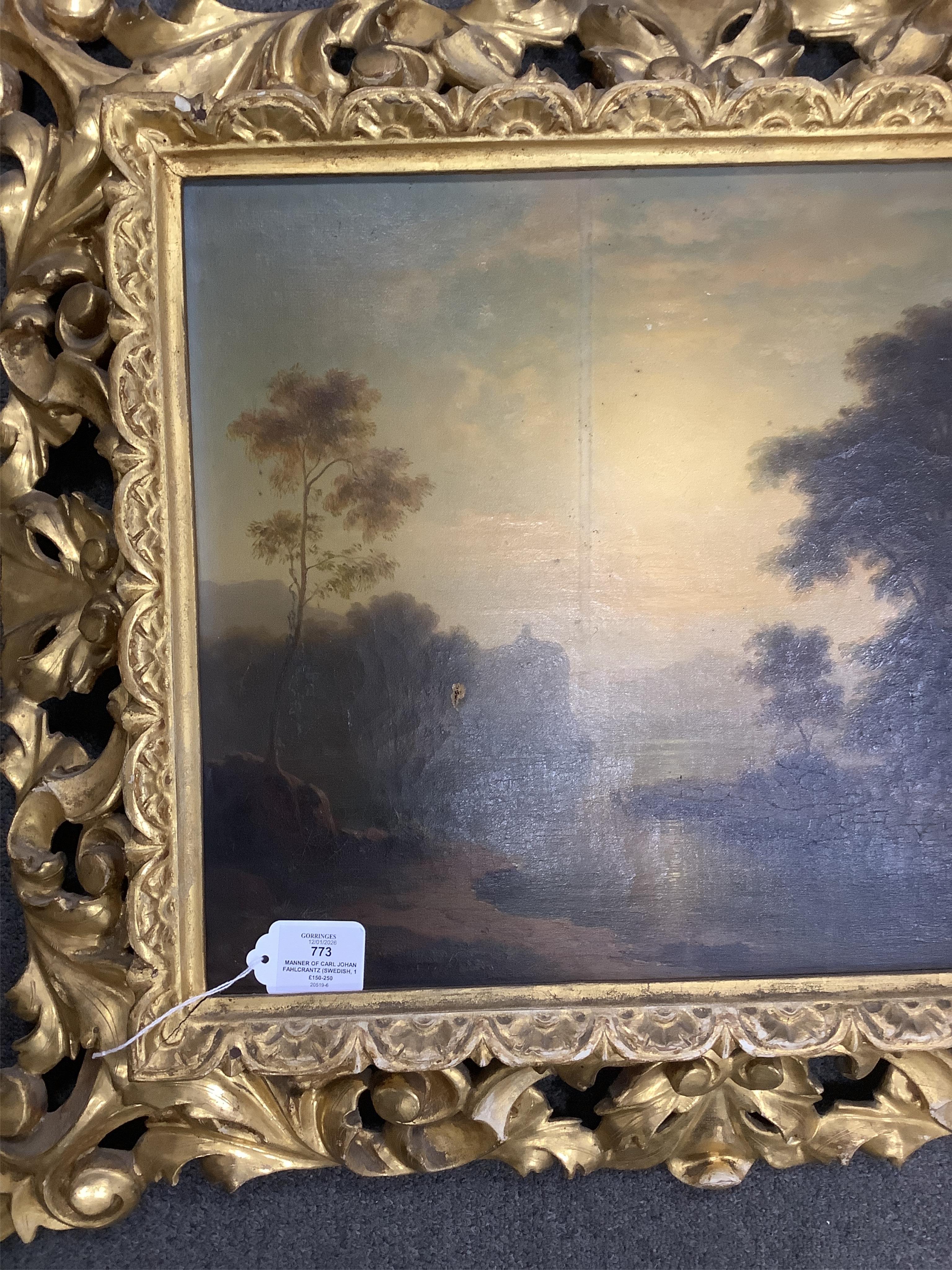 Lot 773 , Manner of Carl Johan Fahlcrantz (Swedish, 1774-1861), riverscape with trees, bears signature, oil on canvas, housed in a Florentine style gilt frame, 38 x 49cm